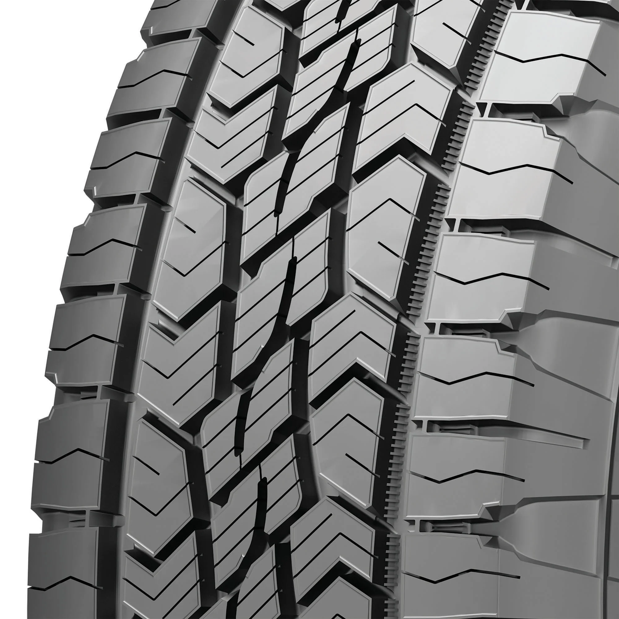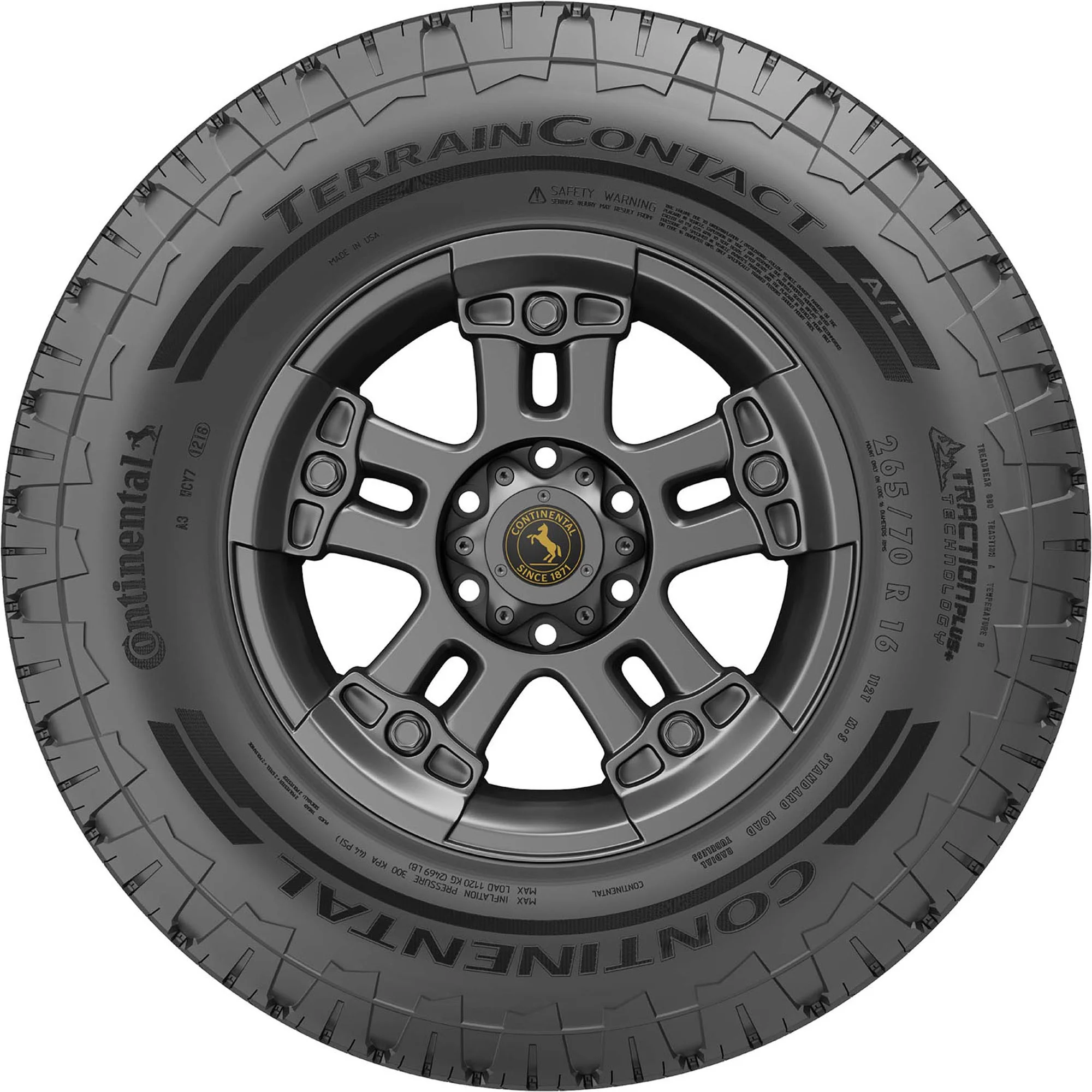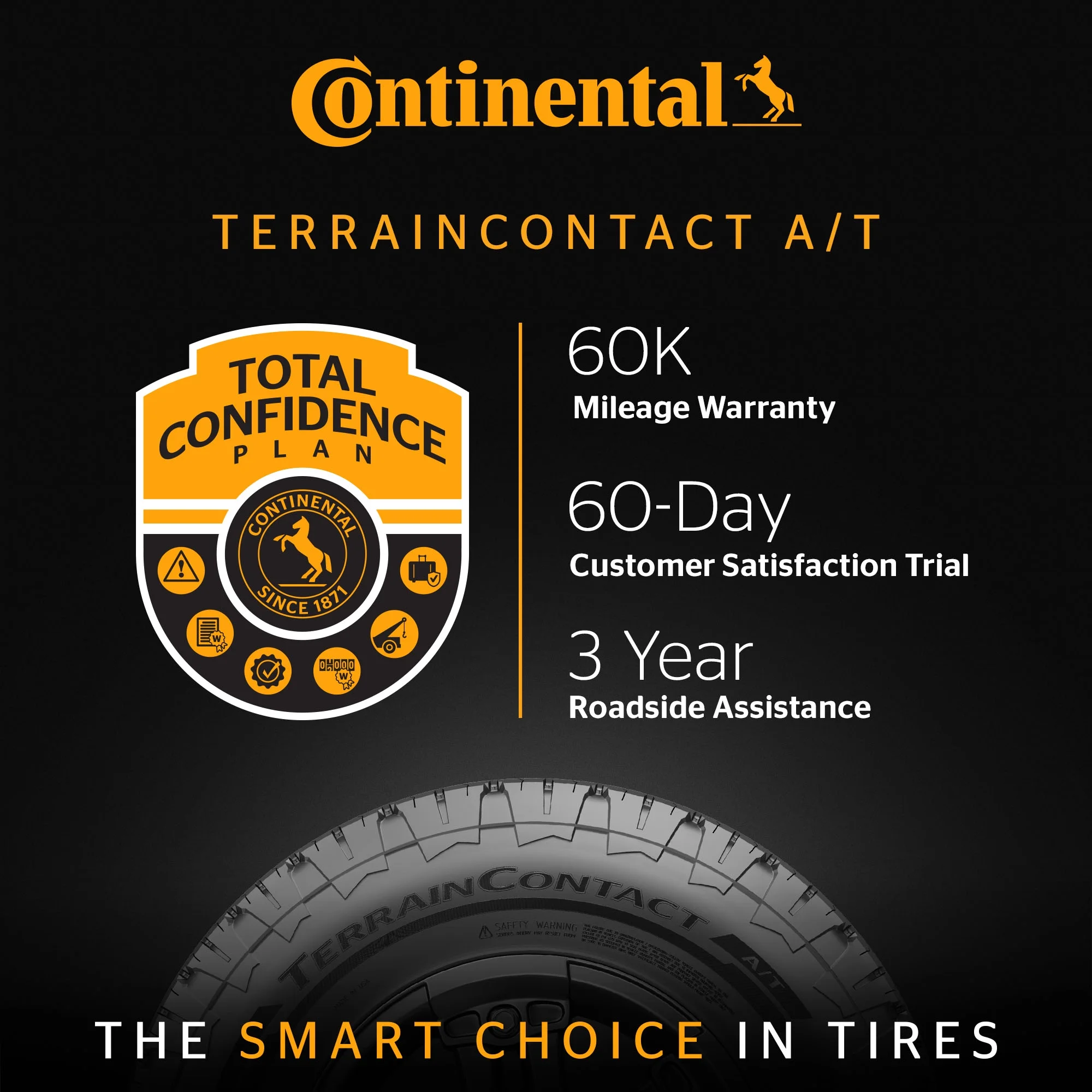 The Continental TerrainContact A/T is a premium all-season all-terrain tire for crossovers, SUVs, and light trucks that is backed by 60,000-mile limited manufacturer tread life coverage. Built for robust durability and balanced traction, the TerrainContact A/T features Continental's TractionPlus Technology (on select sizes) for traction, durability, grip on wet roads, and a quieter road.