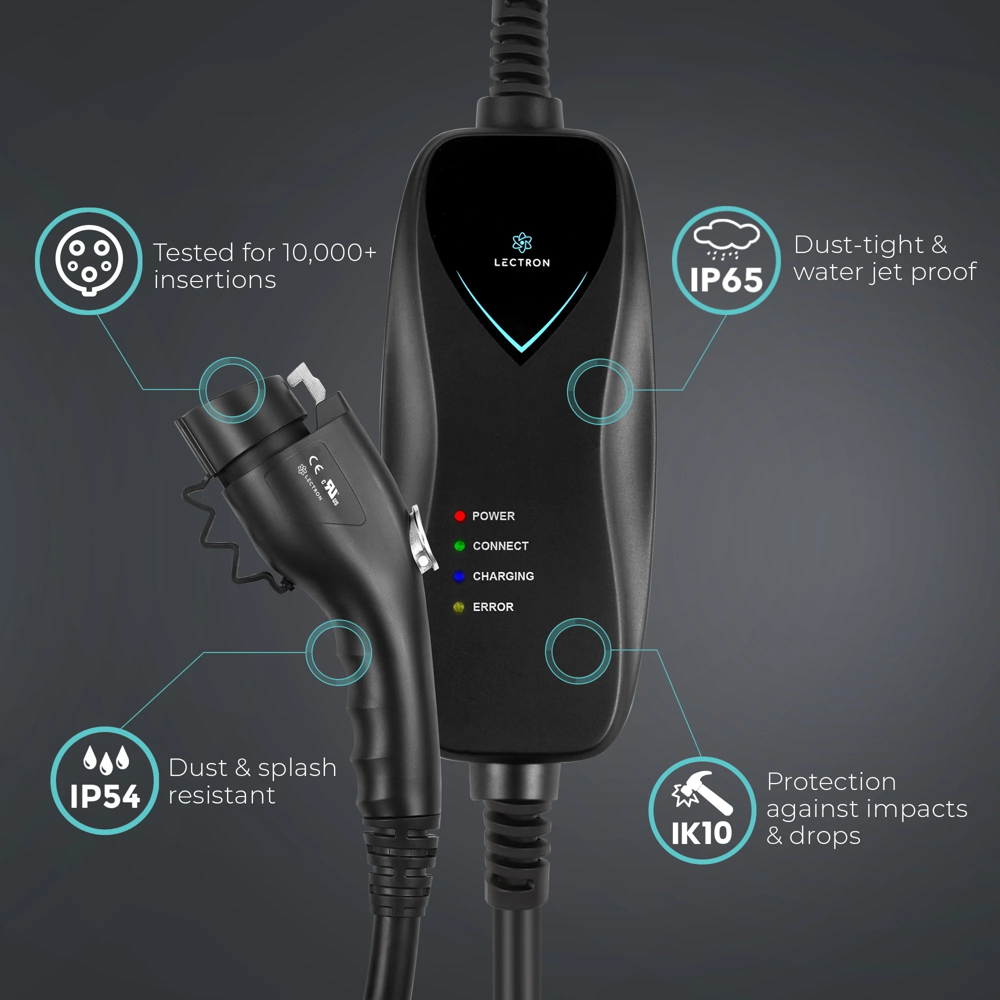 - WIFI & APP CONNECTIVITY - Monitor and control your EV charging remotely through the Lectron app. Stay updated on charging status and adjust the charging current with the touch of a button