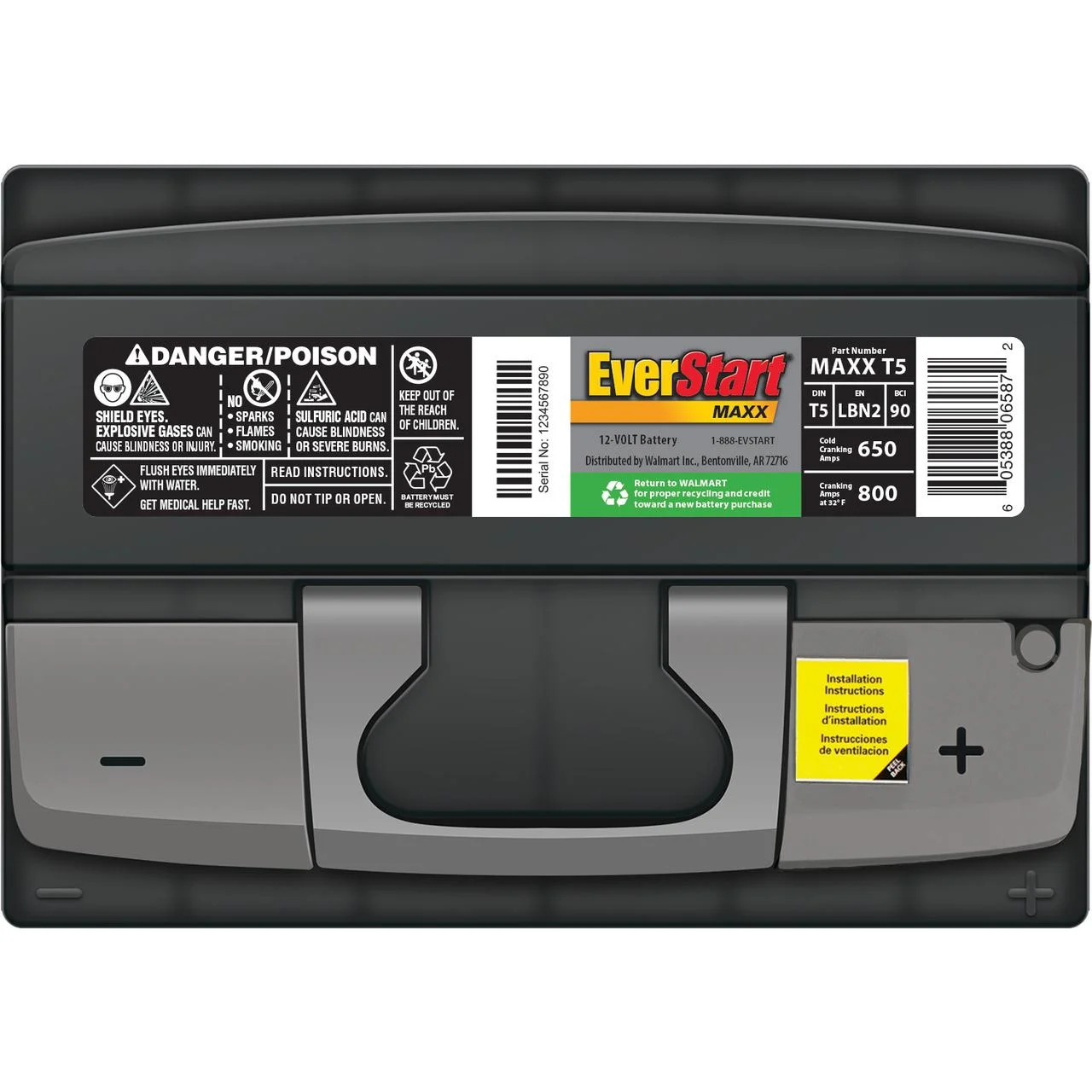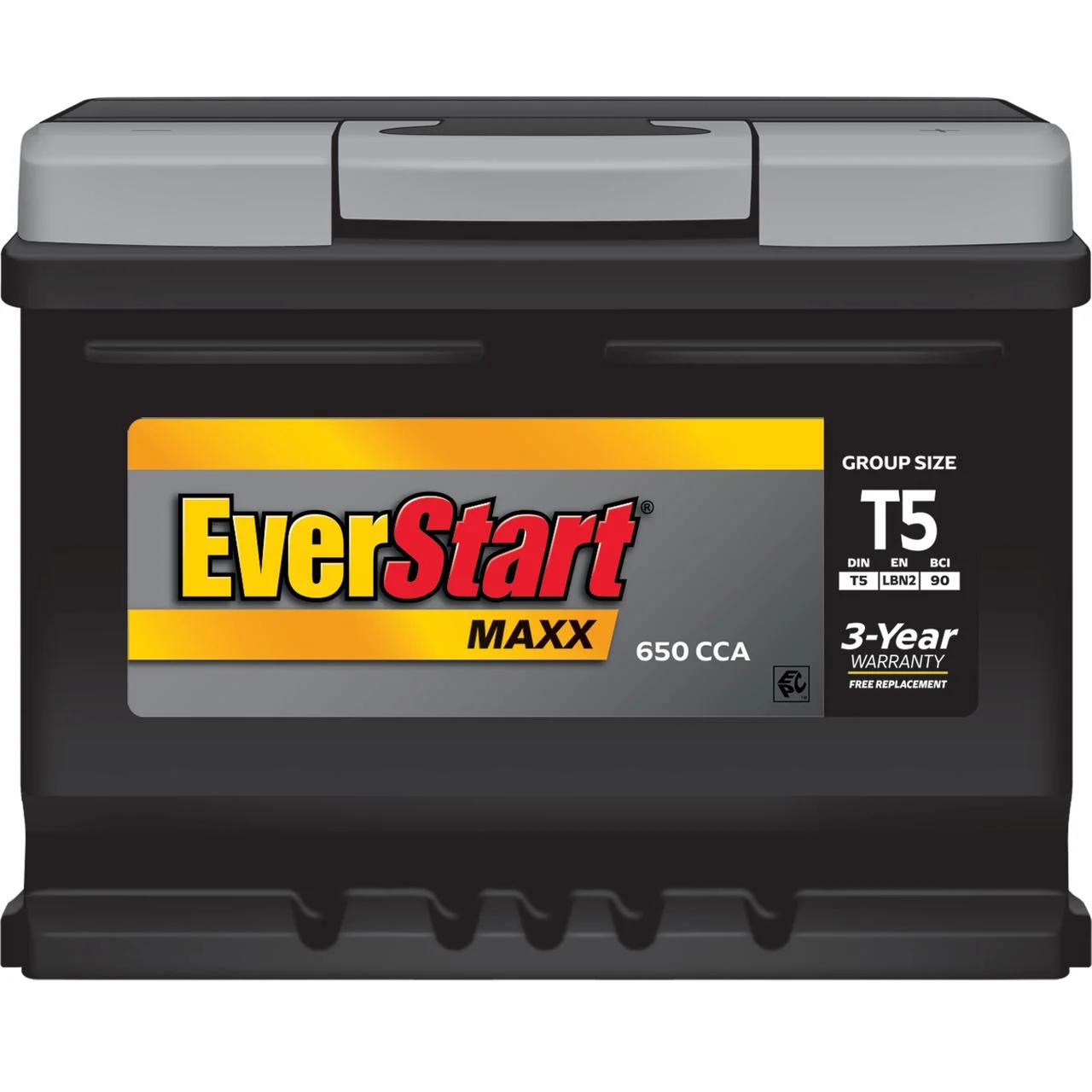 Get your car started and running again with the installation of the EverStart Maxx Automotive Battery, Group Size T5. With a three year warranty this battery will not let you down. Compatible with a range of makes, models and years, it has conveniently located top posts for easily connecting positive and negative terminals. This 12 volt lead acid automotive battery delivers 650 cold cranking amps with 95 minutes of reserve capacity for reliable starts in all weather. This battery is maintenance free and can be conveniently installed and tested at a local Walmart Auto Care Center.