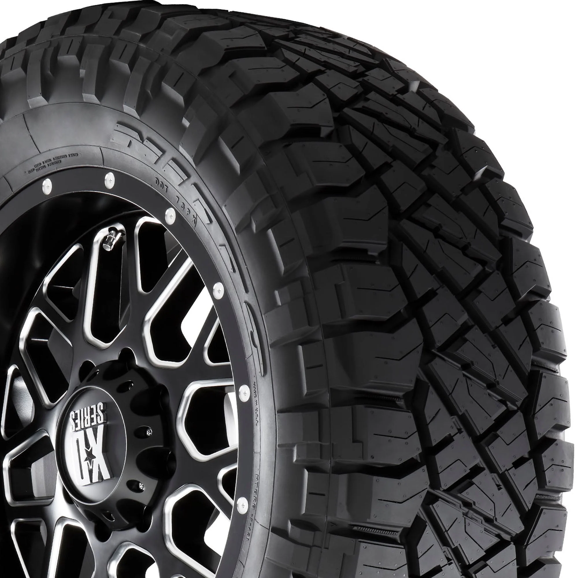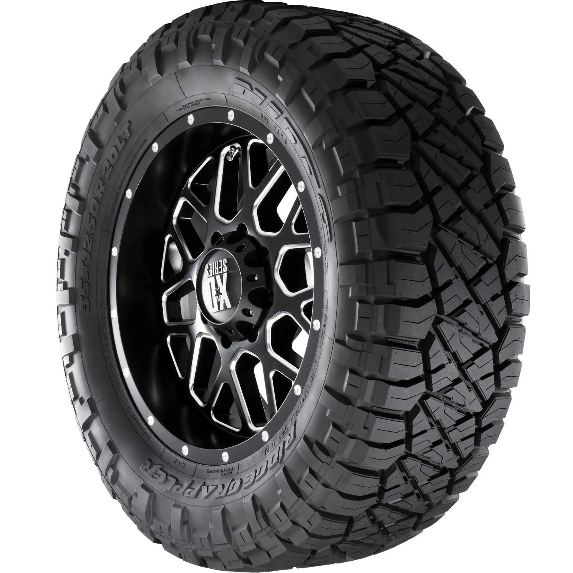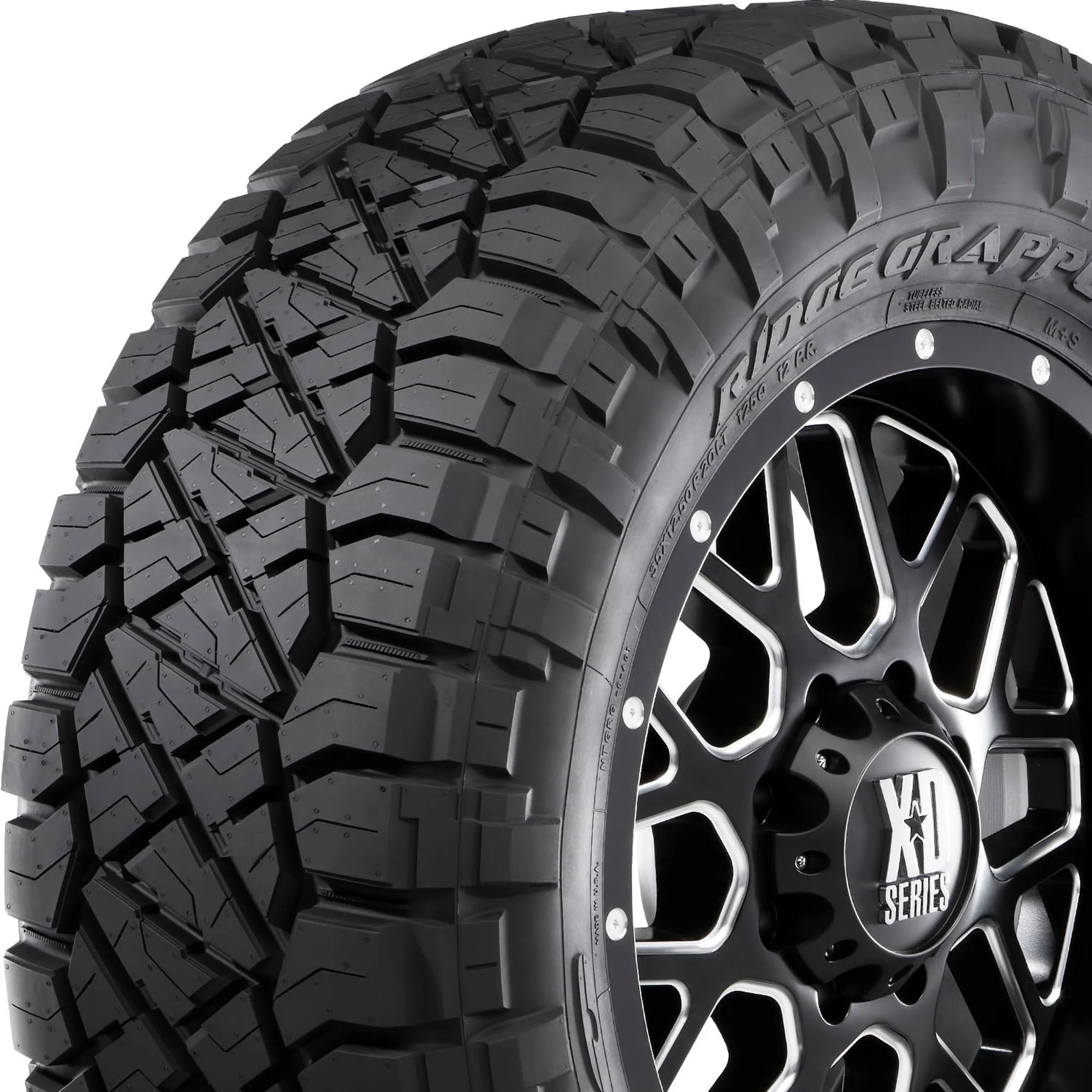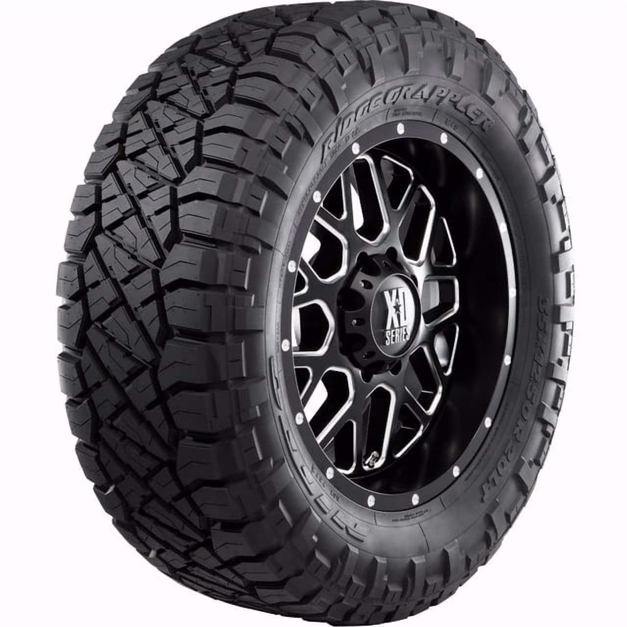 The Nitto Ridge Grappler is a hybrid-terrain light truck tire engineered to deliver a quiet on-road ride with capable off-road performance. Highway comfort is provided by a Variable Pitch Tread Pattern that reduces road noise. A key feature is its dual-sidewall design with two different looks for a customizable appearance. For off-road traction, aggressive shoulder grooves clear mud, while staggered shoulder lugs and lateral Z-grooves provide biting edges. Durability is enhanced by a reinforced block foundation that reduces flex and stone ejectors that protect the tread, while step block edges create additional traction.