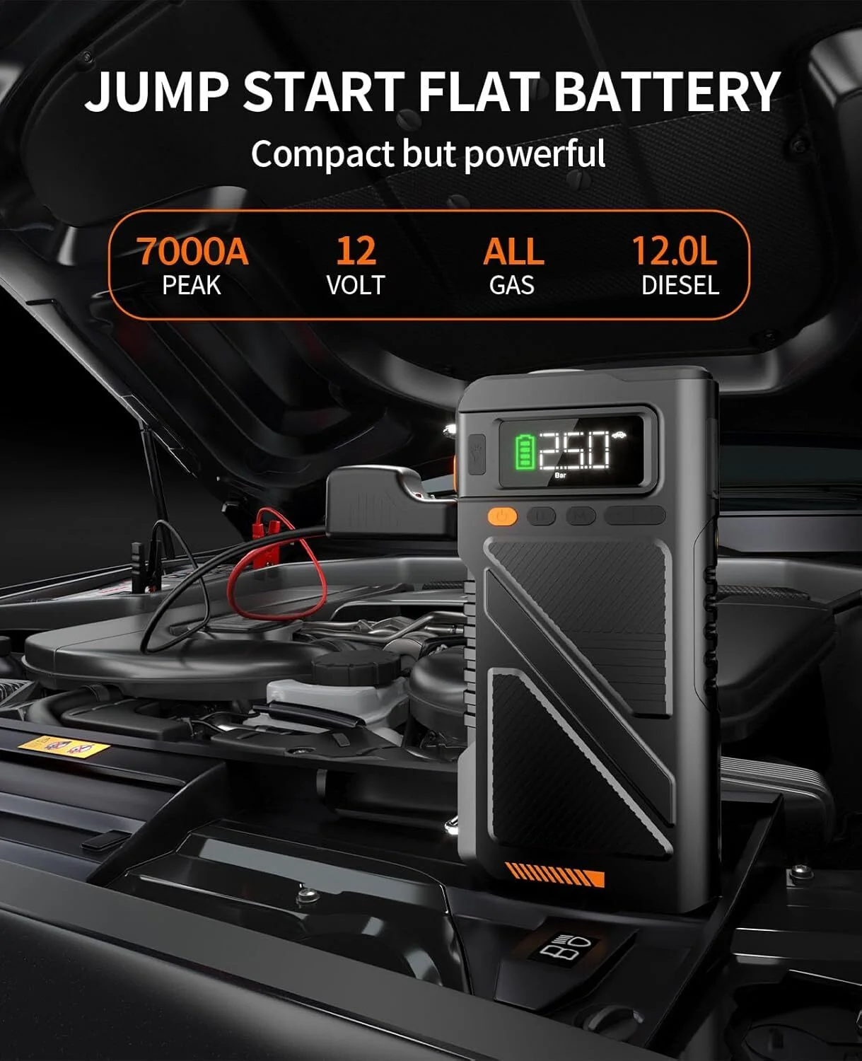 - ???7000A Instant Jump Start:Powers all gas engines and 12L diesel vehicles (-4��F to 140��F) with military-grade clamps - never stranded again.
