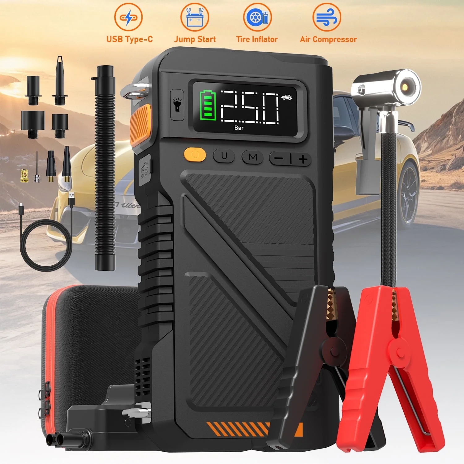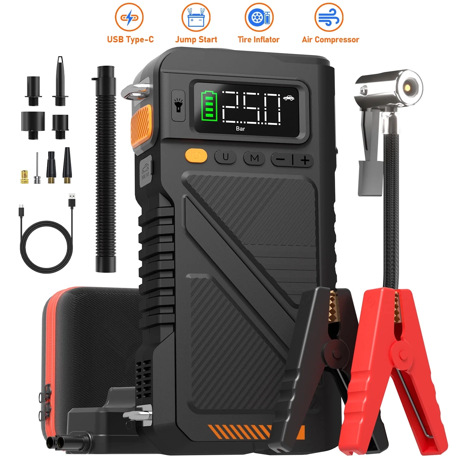 ??9 in 1 Jump Starter: The car battery jumper starter features car jump starter,tire pressure detection, car tire inflation, inflatabledeflator function, power bank, 3-mode emergency lights (flashlight, SOS, strobe). Compact and powerful, it's a great choice used for outdoor road trip.