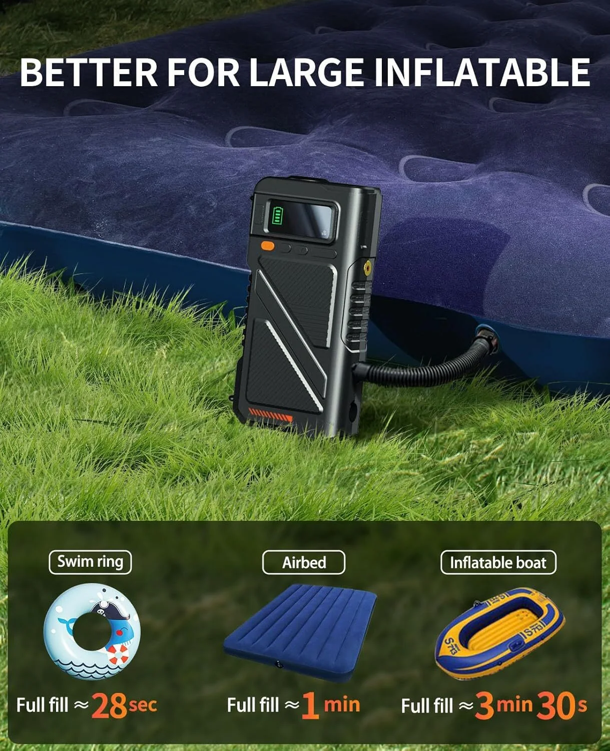 - ???Smart Cordless Inflation System:4 specialized nozzles for tires, air mattresses, boats and toys with real-time PSI/KPA/BAR monitoring (unlike basic compressors).