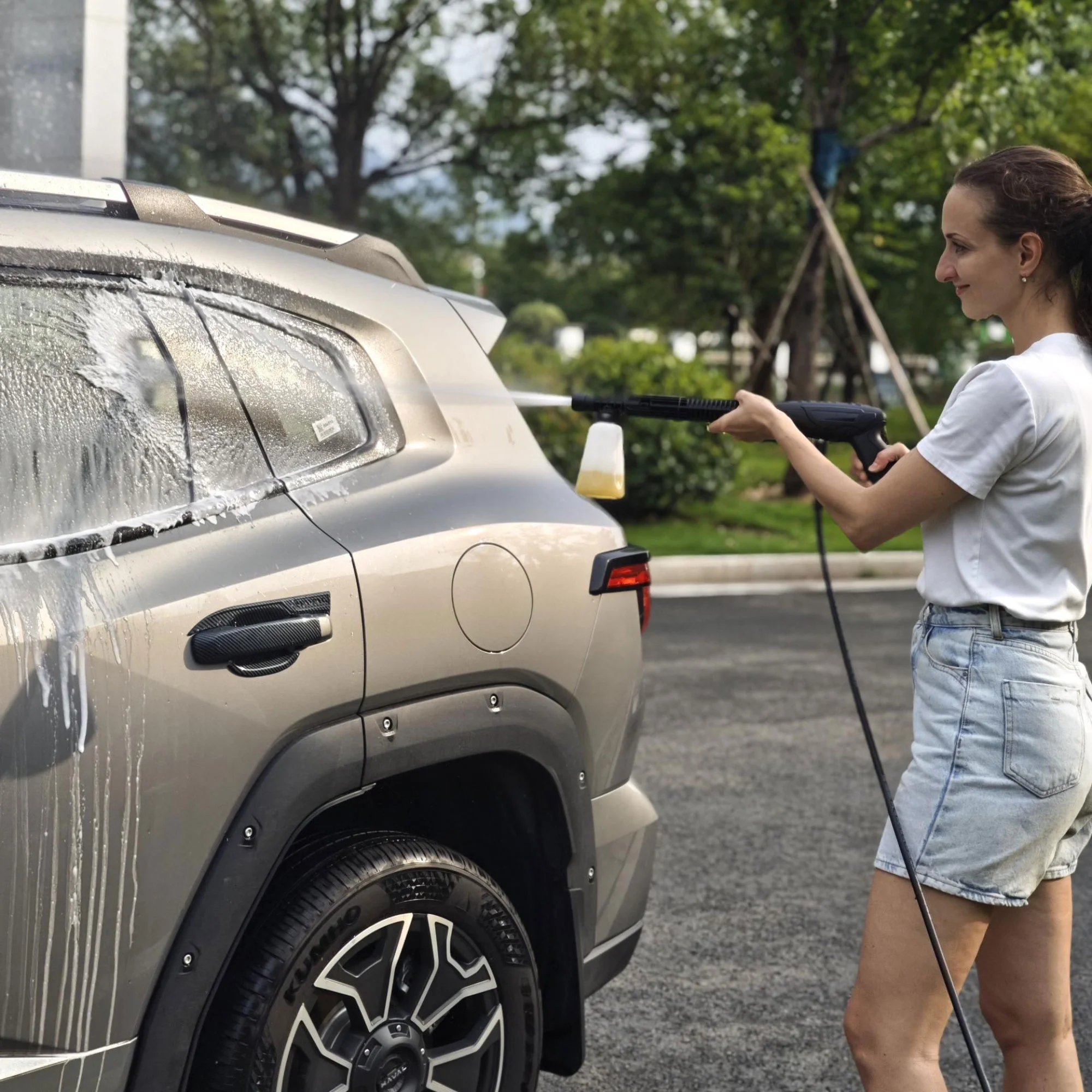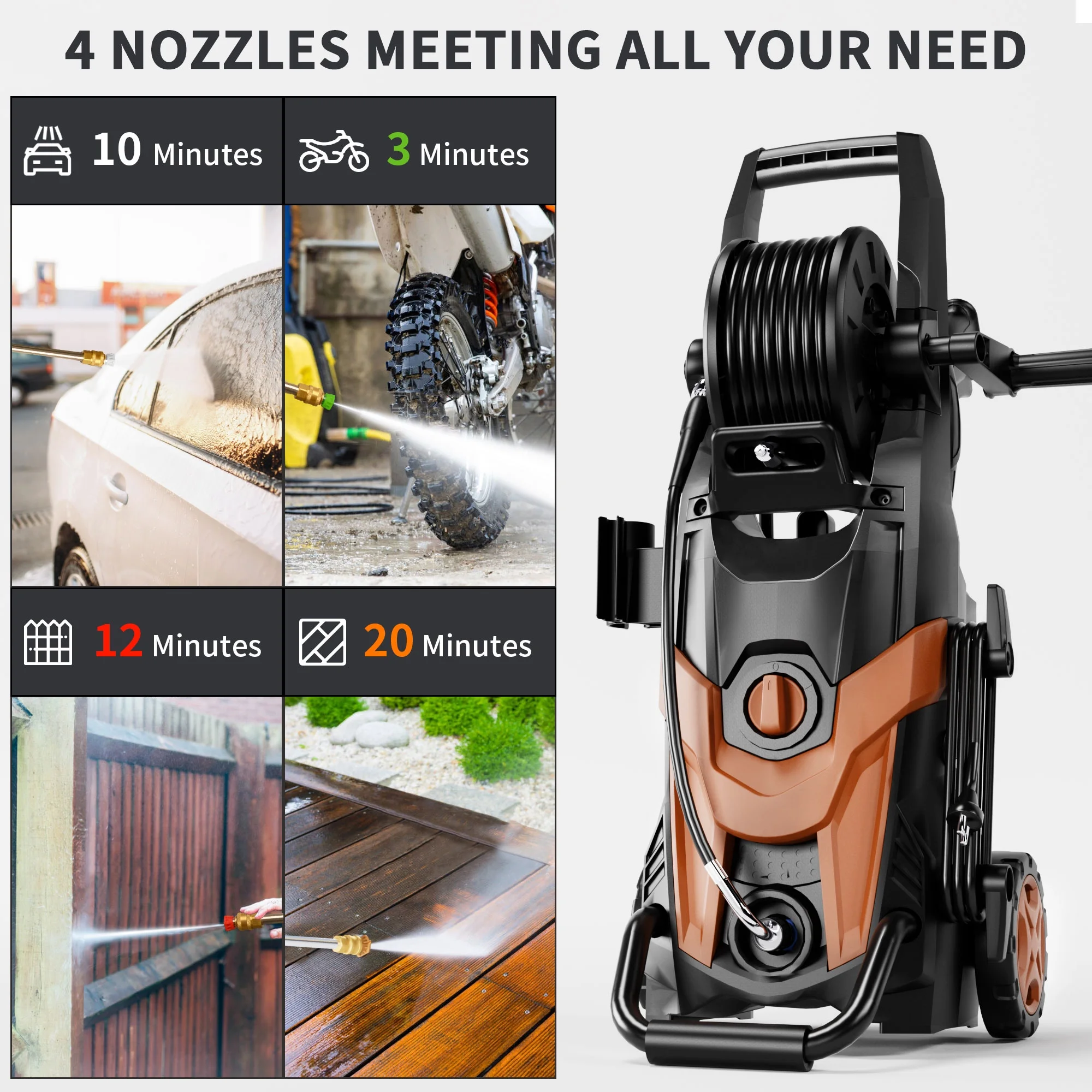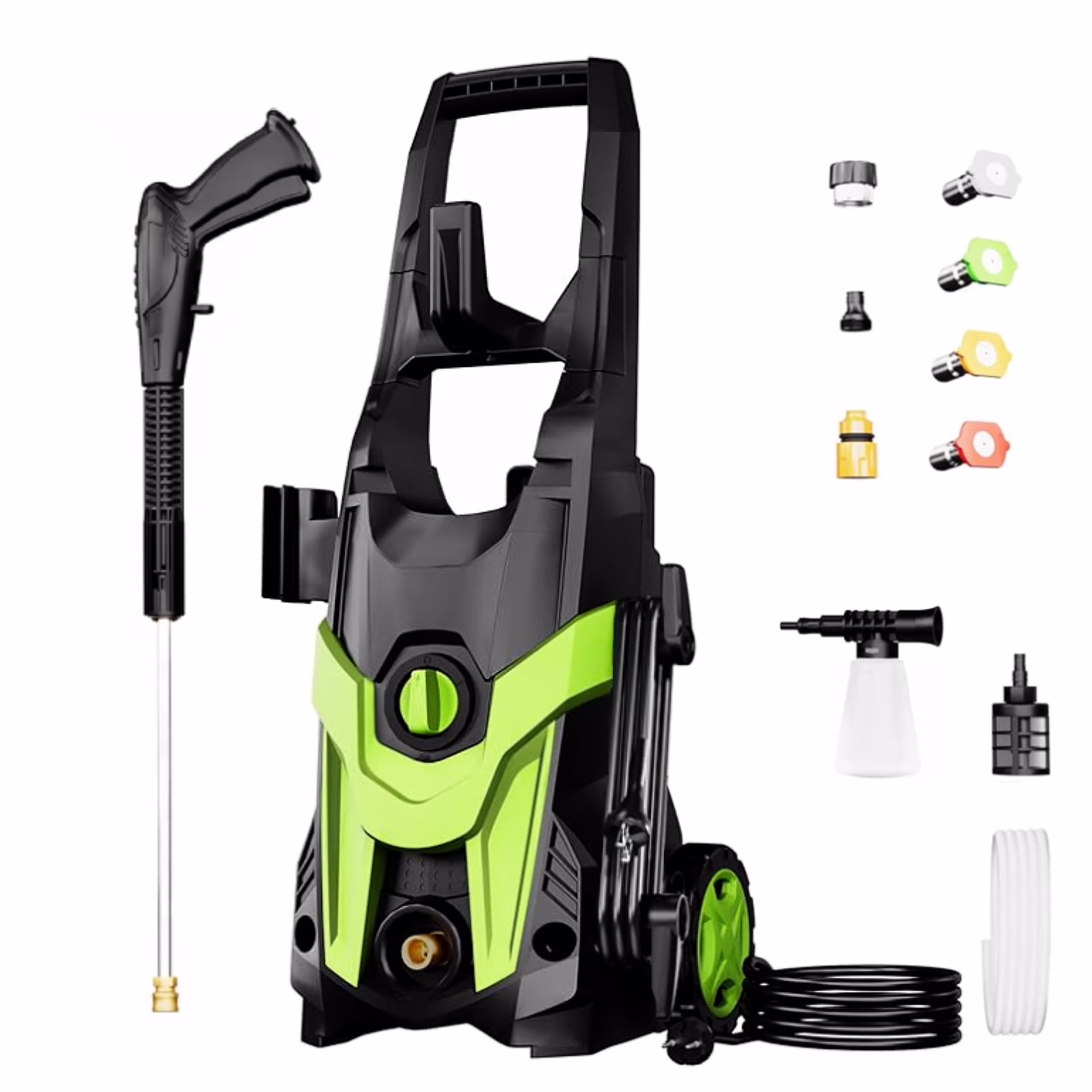 - ��EASY TO MOVE & STORE��: With a wheeled upright trolley, power washer is easy and safe to move around. Mesh stock on both sides hold the spray gun, providing convenient storage. Additionally, the cable hook keeps electric cable tidy, ensuring a neat and organized setup