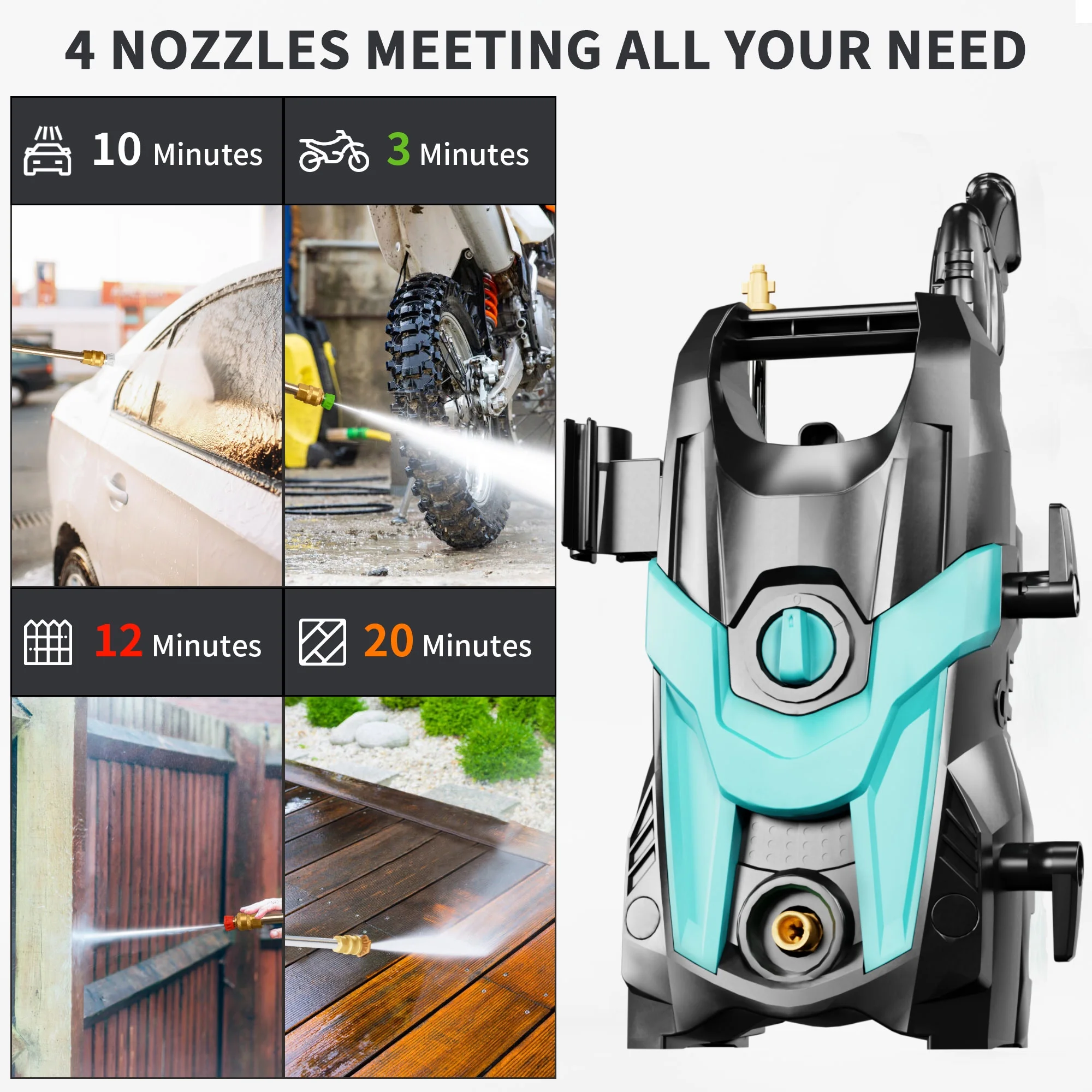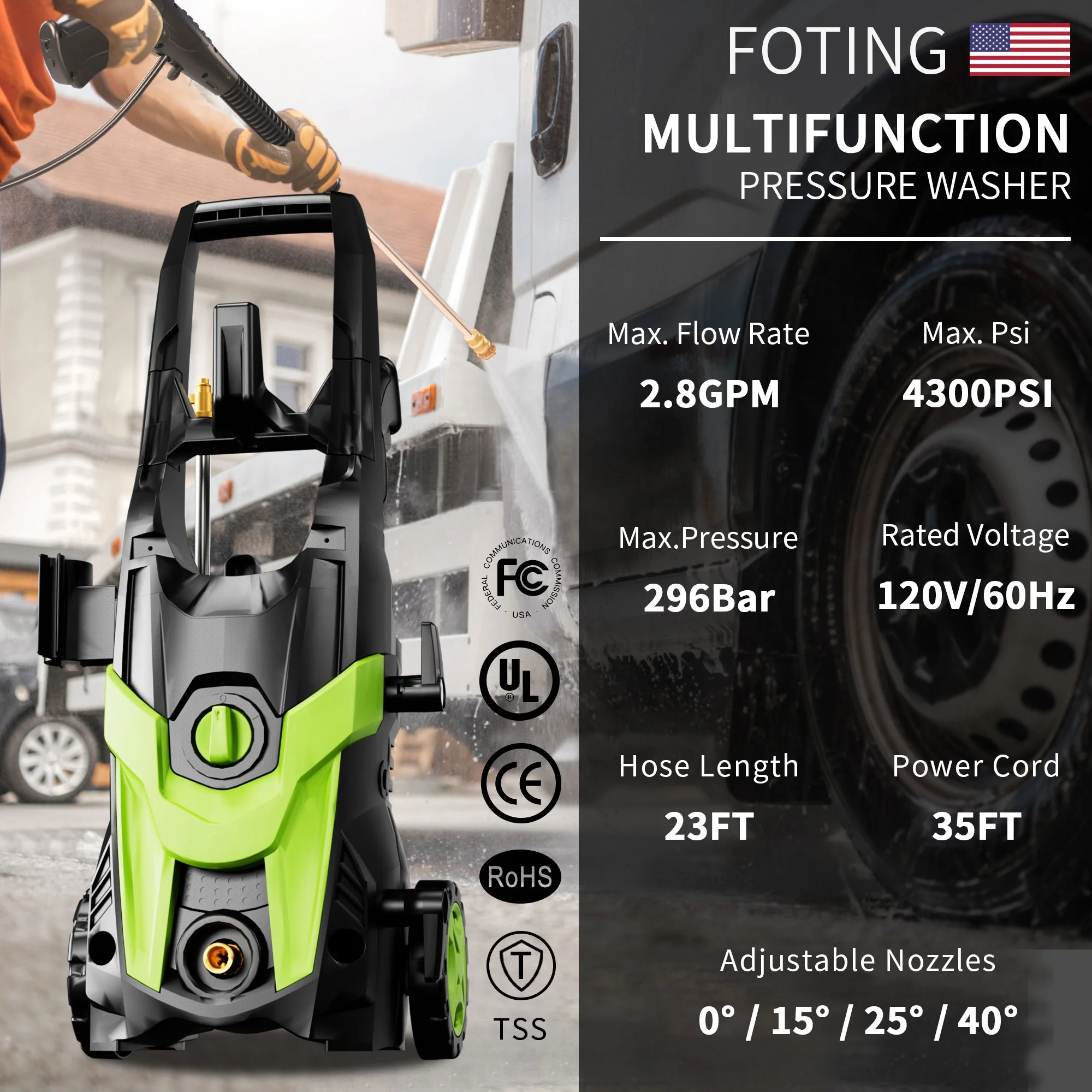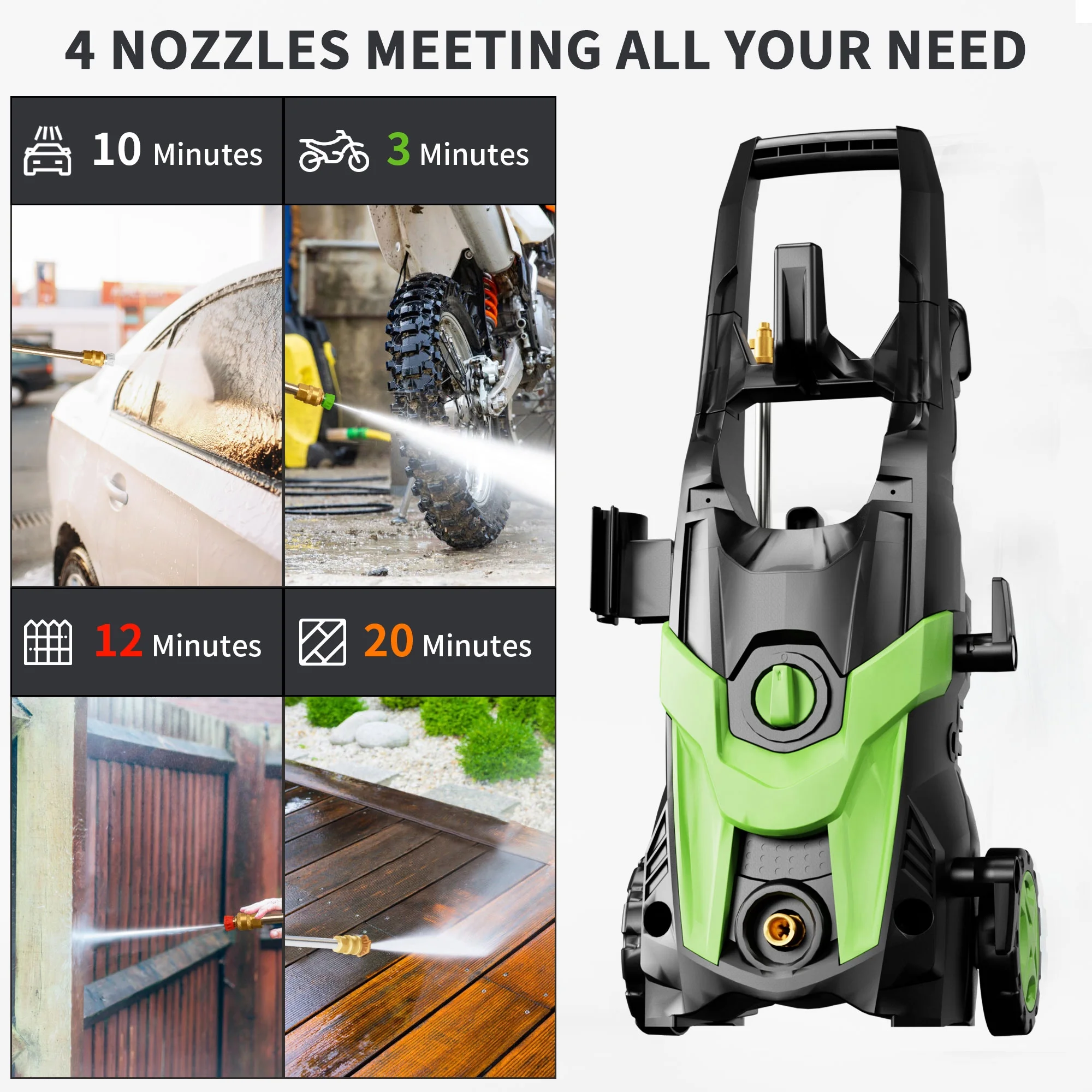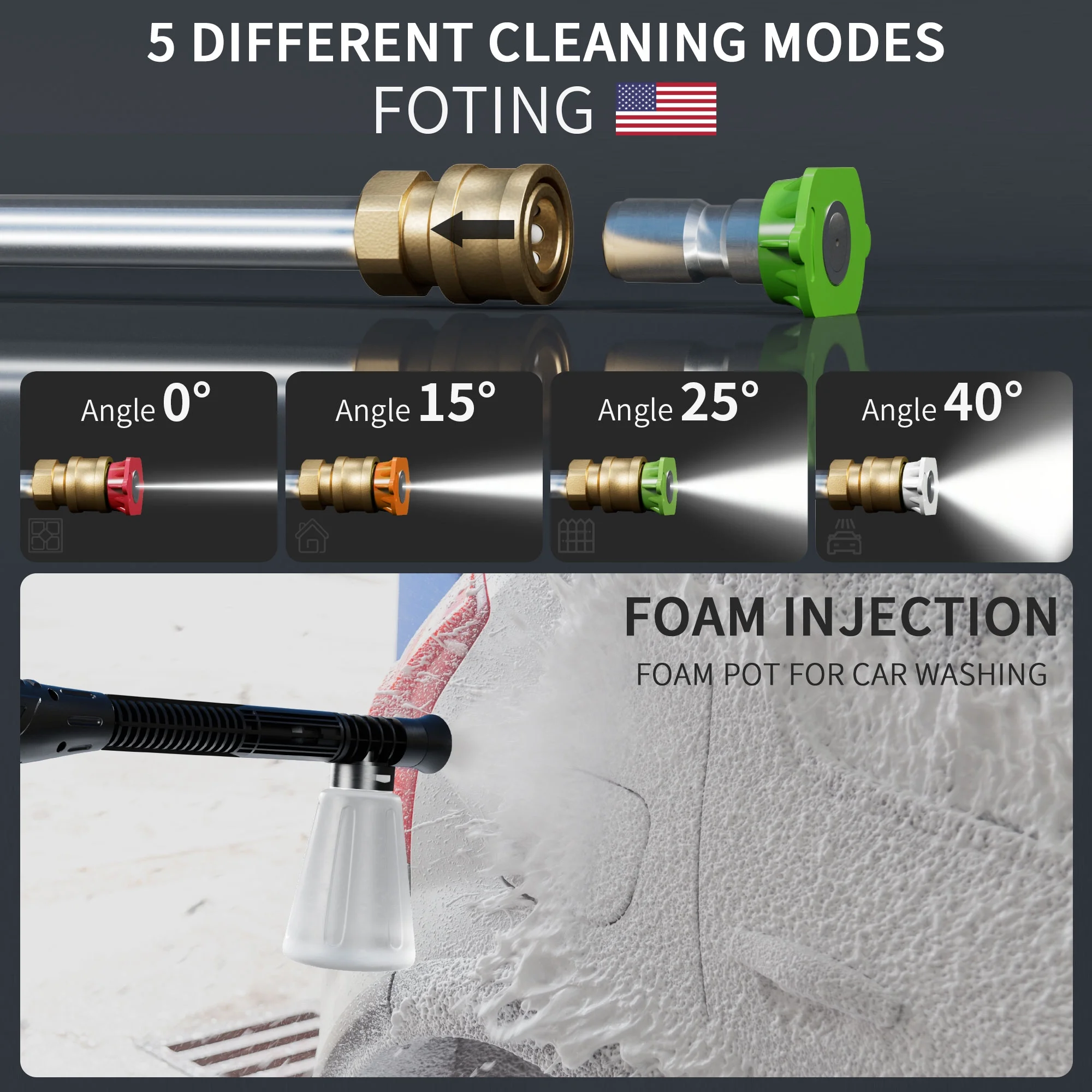 - ��ADJUSTABLE PRESSURE NOZZLE��: Adjustable Pressure Nozzle is equipped with 4 quick-connect spray tips (0��, 15��, 25��, and 40��) Whether light, medium, or heavy-duty cleaning, simply select appropriate pressure washer nozzle to tackle the task at hand. Simplify FOTING cleaning routine and achieve efficient results.