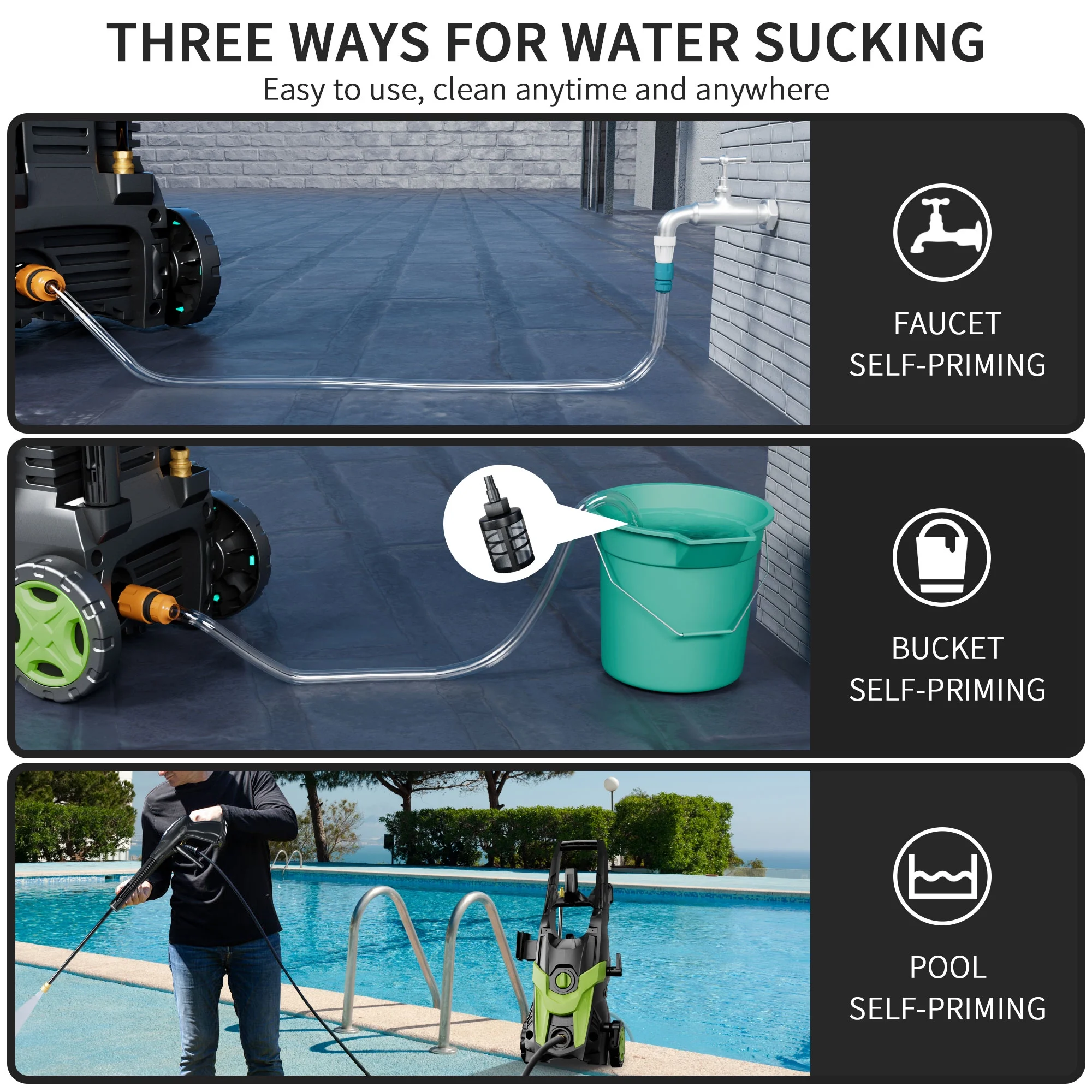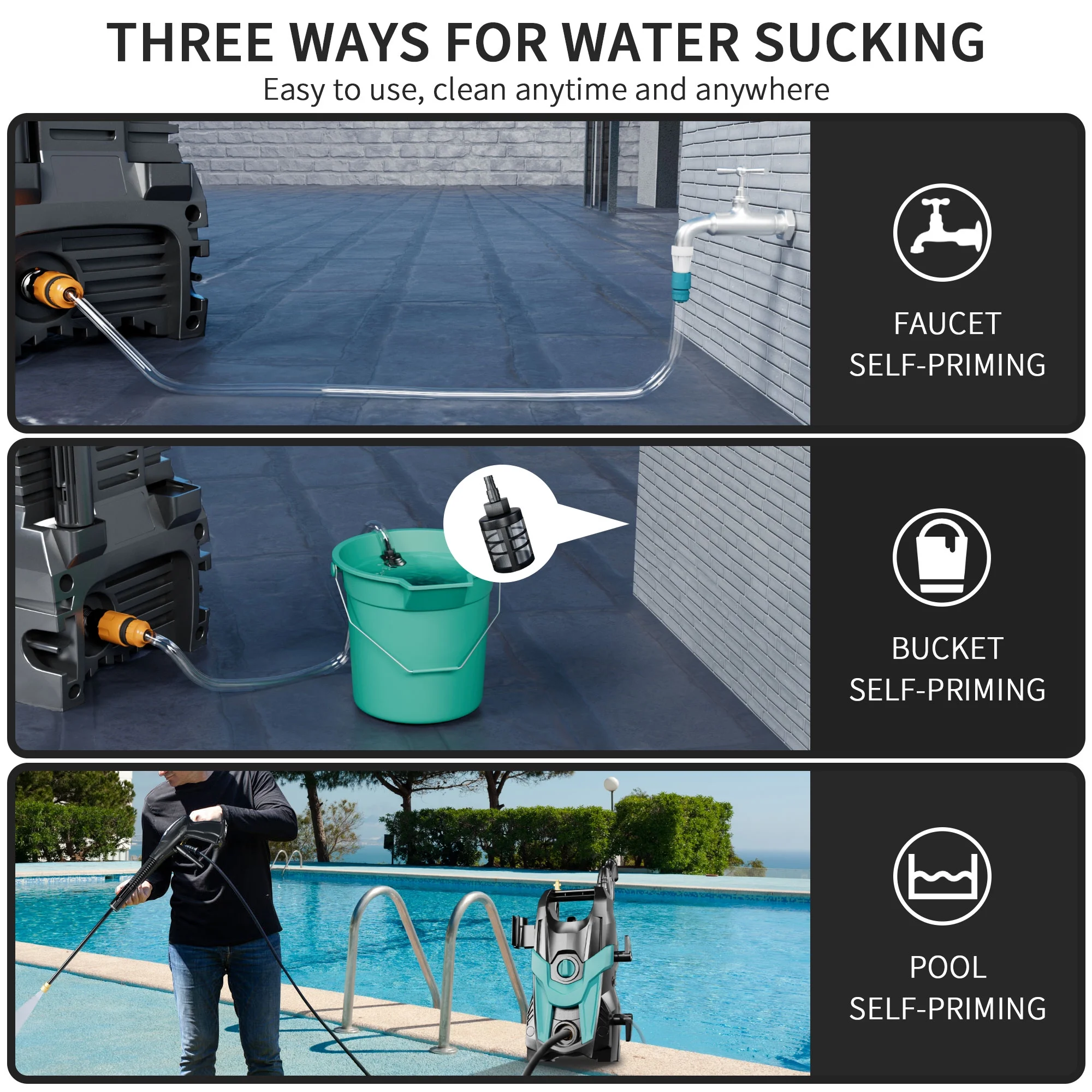 - ��TTS SYSTEM��: Equipped with Safety Automatic Total Stop System (TSS), make power washer automatically shuts off the pump when the trigger is not engaged, saving energy and prolongs the pump's life. 10000 rest times of use make it energy-efficient and durable.