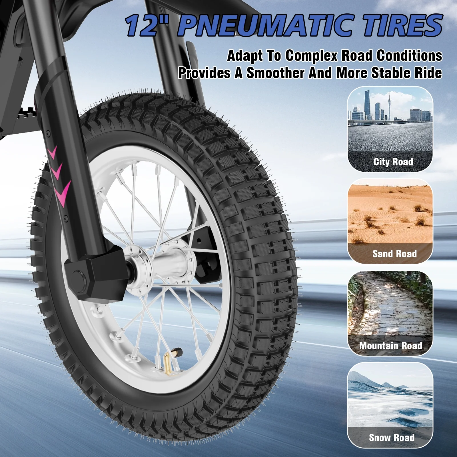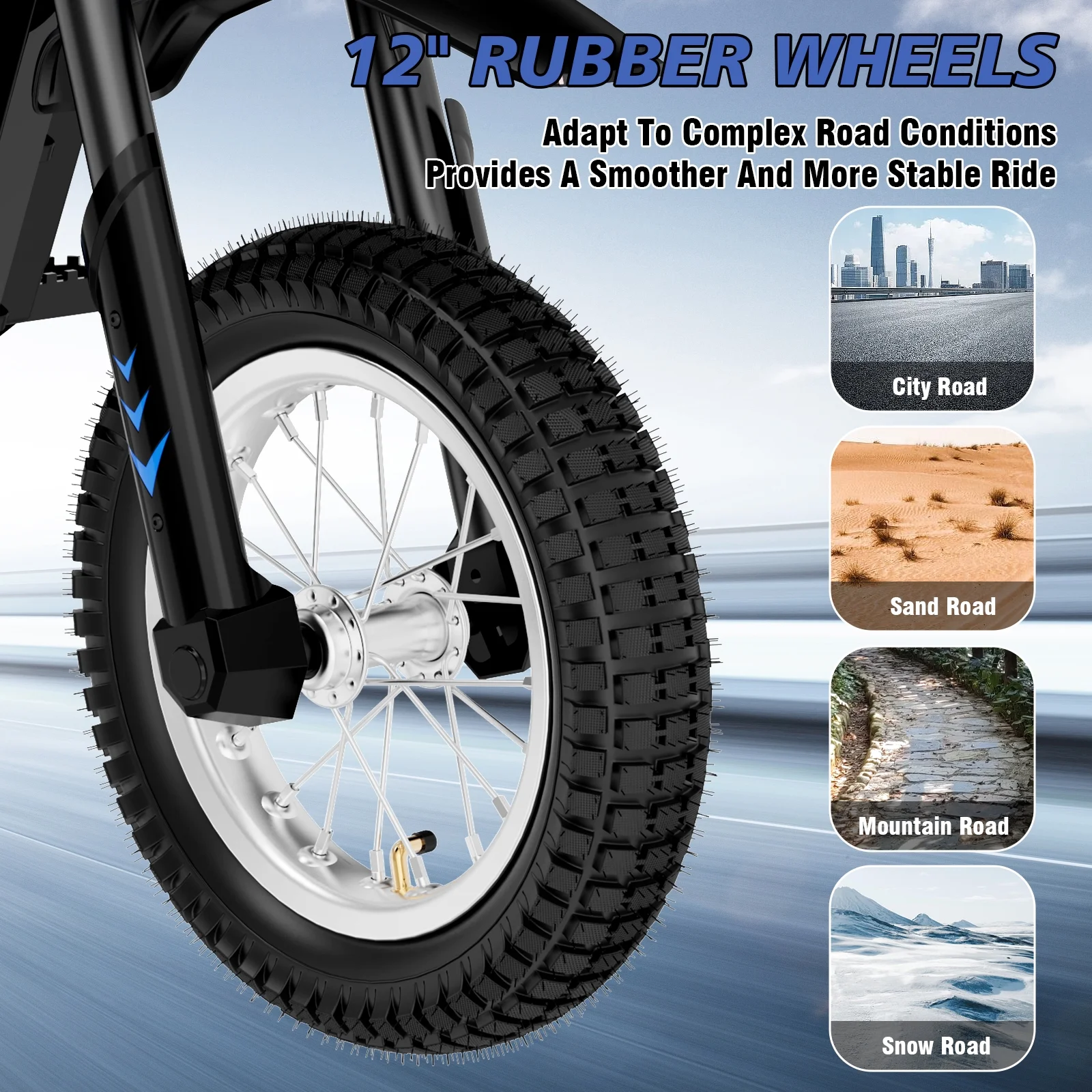 This powerful bike features a 300W motor and can carry up to 143 pounds. With a top speed of 15.5 MPH and a 36V 5.2AH battery offering a range of 9.3 miles, it's perfect for young riders of varying skill levels. The high-elastic suspension system and drum brake system ensure a safe and smooth ride. The 12" wear-resistant rubber wheels and comfortable, non-slip seat enhance the overall experience. Give your kids the thrill of a comfortable off-road adventure ride!