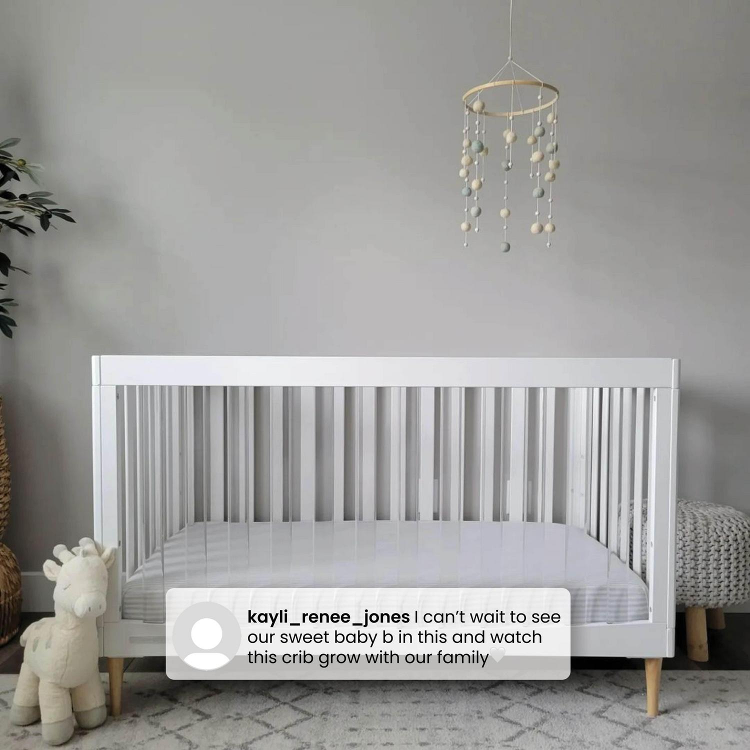 – 4-IN-1 CONVERTIBLE CRIB: Crib converts to toddler bed. daybed and sofa (Daybed/Sofa Rail included. Toddler Guardrail #0094 sold separately) | Available in Bianca White and Midnight Grey | Crib features clear acrylic slats in the front. wood slats on the other 3 sides and natural wood feet