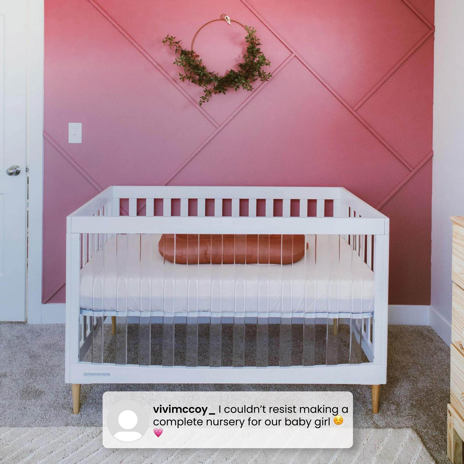 The Austin Acrylic 4-in-1 Convertible Crib by Delta Children is the ultimate statement piece for any modern nursery. The front of the crib boasts recyclable and non-toxic clear acrylic slats while the three other sides feature wood slats made from sustainable materials like New Zealand pine the crib s natural-colored wood feet tie the whole look together. A one-of-a-kind design for your baby s stylish room. the crib s adjustable mattress support allows you to lower the mattress height as your baby grows. When your child is ready. its versatile design easily adapts from crib to a cozy toddler bed. daybed and sofa (Daybed/Sofa Rail included. Toddler Guardrail #0094 sold separately). Plus. it s GREENGUARD Gold Certified. which means it s built to contribute to cleaner air for a healthy home. Available in Bianca White/Natural and Midnight Grey/Natural. Easily mix. match. and layer with other items from Delta Children.
