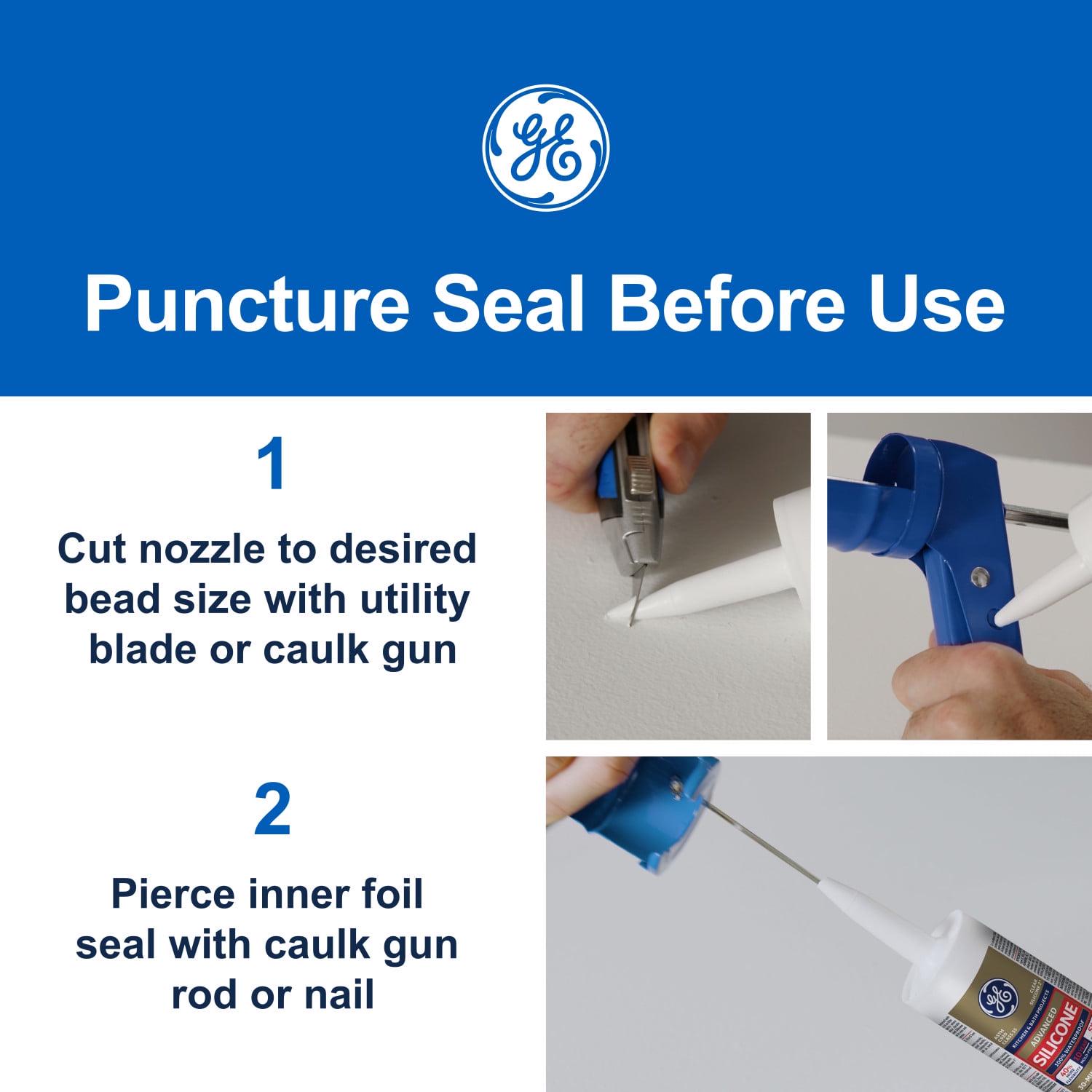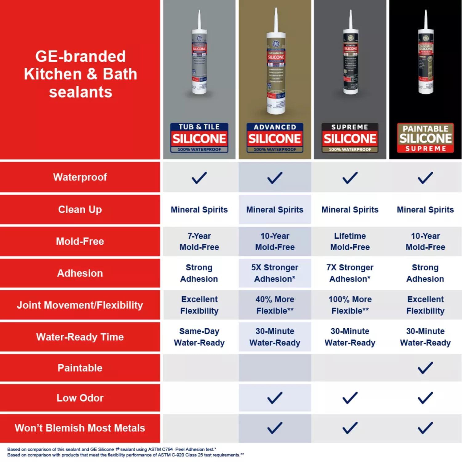 GE Advanced Silicone 2 Kitchen and Bath sealant is a high-performance. 100% silicone and 100% waterproof sealant ideal for areas prone to water exposure. GE Advanced Silicone 2 Kitchen and Bath sealant is permanently flexible with 40% more flexibility than Class 25 sealants and has 5X stronger adhesion than our Silicone 1 sealant. It will not discolor most high-end metal finishes such as chrome. bronze. and nickel. This sealant also has a low odor while curing thanks to its neutral-cure formula. Its 30-minute water-ready formula offers 10-year mold-free product protection to protect against mold and mildew growth. Use our silicone kitchen and bathroom sealant on a variety of common surfaces. including most metals. plastics. and woods; glass. drywall. plaster. granite. and more. Product color is Clear. Product comes in a 10.1 fl oz Cartridge.