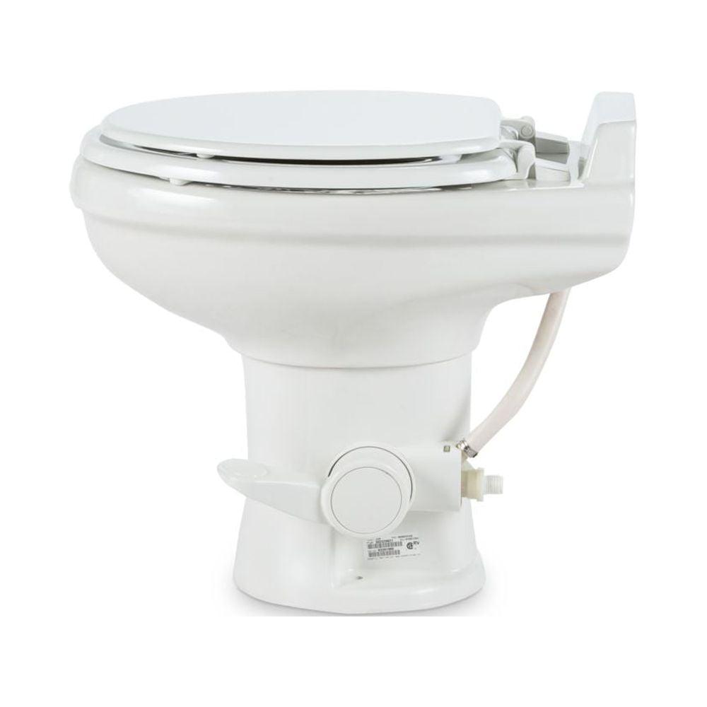Enjoy all the best features of a household toilet in your RV with a Dometic 3″0 Elongated Ceramic Toilet. The elongated. deep ceramic bowl and enamelled wood seat offer comfort that far surpasses most smaller RV toilets. The pressurized full-rim flush delivers a bowl-clearing rinse every time. The ergonomic one-direction foot pedal action results in easy. hands-free flushing for added sanitary benefits. The sparkling vitreous ceramic bowl keeps its original beauty for years. 3″0 series RV toilets are available in White or bone colors. in standard or low-profile heights. and with or without a separately mounted hand sprayer.