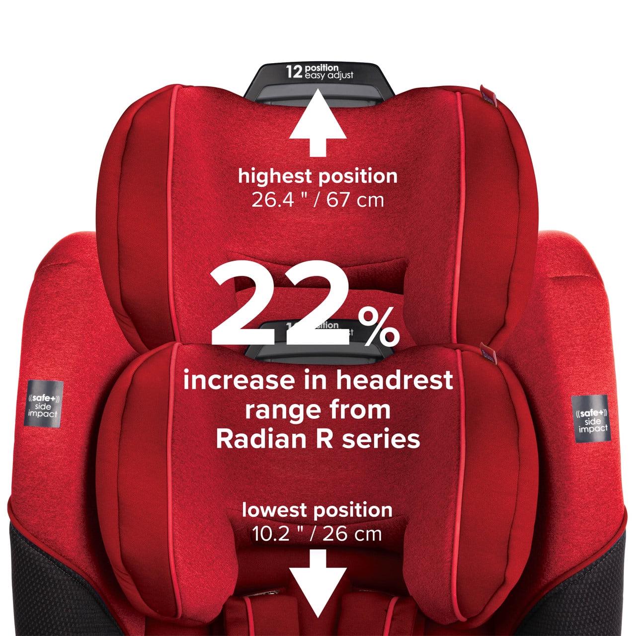 – Safe+ 12 headrest positions with one hand easy-adjust – contoured to improve child head containment and provides a 22% increase in occupancy range from the Radian R Series