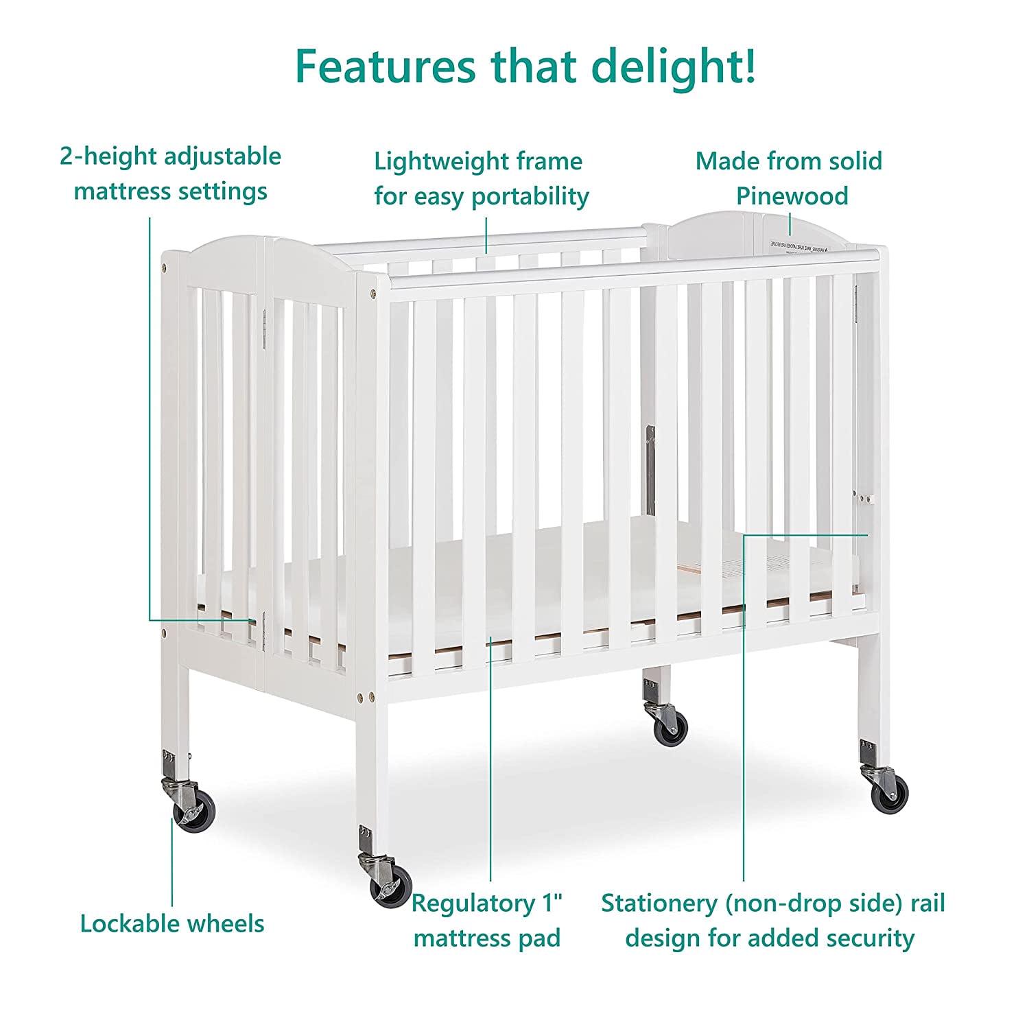 CONVENIENCE MAX: A full-size crib that comes with a two-position mattress support to keep pace with your growing baby.COMPACT & PORTABLE: When the crib is not needed. simply fold flat using the patented folding system and store. No disassembly required – unfold and use again when needed! Lightweight frame and wheels allow you to move it easily from room to room.SAFETY MATTERS: The stationary (non-drop side) rail system (US Patented rail system. PATENT / B2) and wheels provide the utmost in product safety. It meets or exceeds applicable ASTM standards.CLEAN DESIGN: The crib features a minimalist design. Choose from beautiful water based paints/non toxic finishes options and mix and match with any room theme and tools for easy assembly included.PRODUCT SPECS: Crib dimensions are 40L x 26W x 38H. It weighs 30.5 lbs. Don t expose your furniture to strong sunlight or extreme changes in temperature or moisture which can damage or fade its color