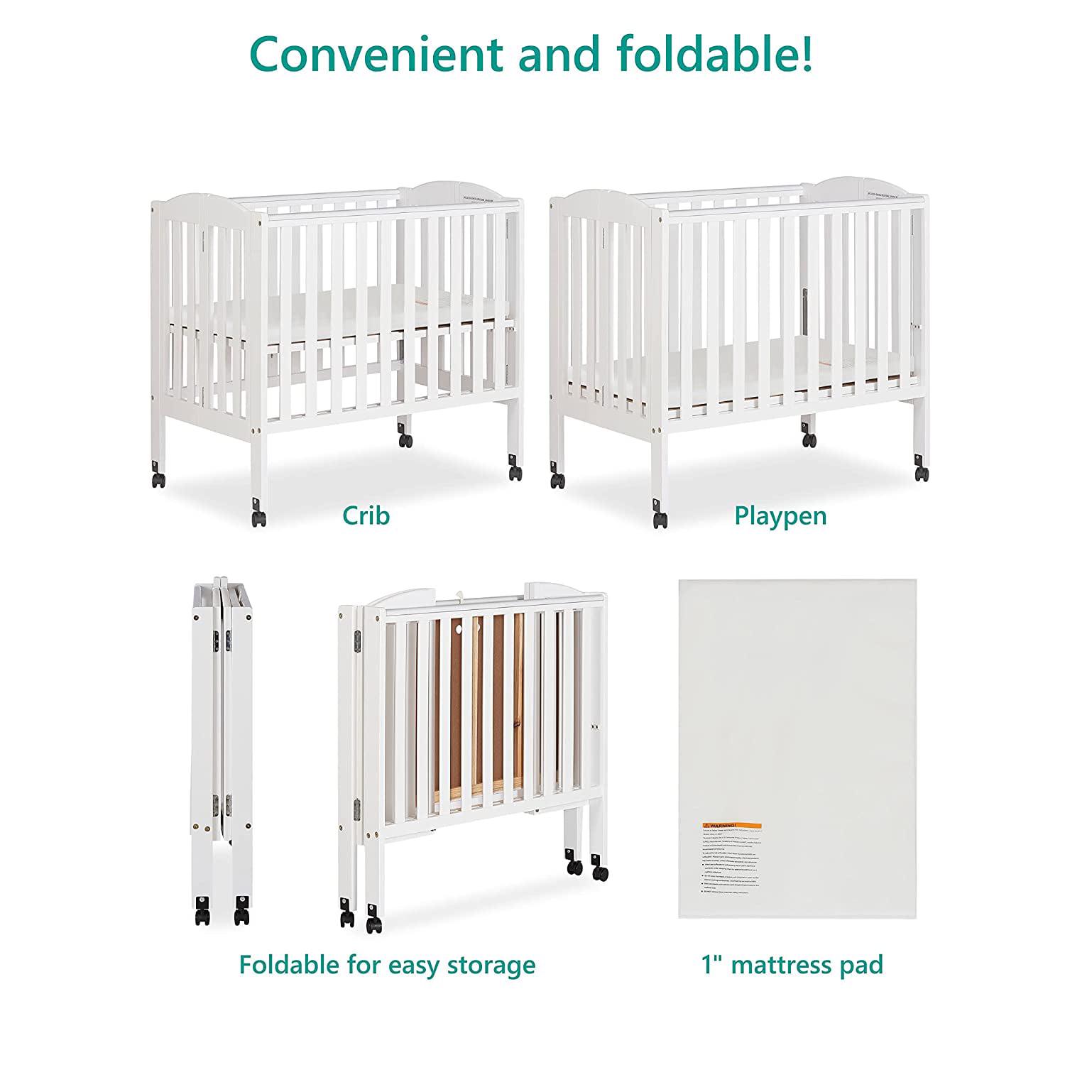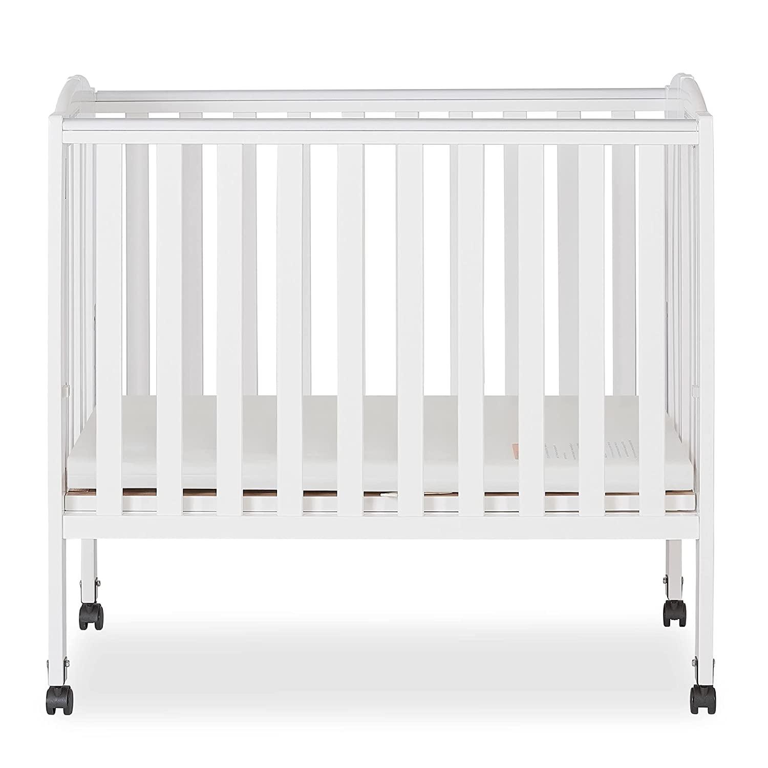 Dream on Me 2 - in - 1 Folding Portable Mini Crib in White. Mattress Pad Included. Easy to Fold and Store Baby Crib. Two Adjustable Mattress Height Positions Convertible Crib