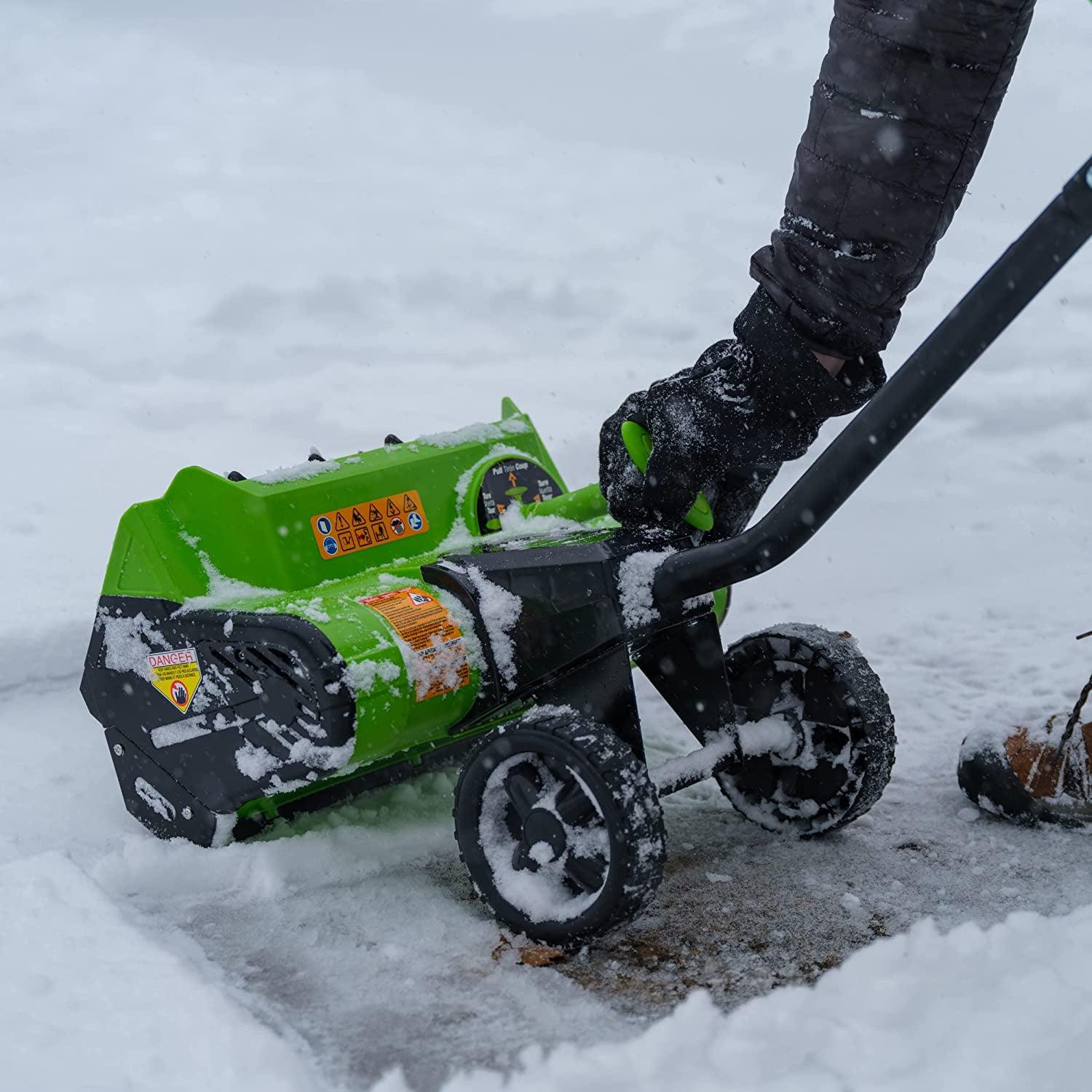 This Earthwise Cordless 40 Volt snow thrower features a push button start. 16-inch clearing width and up to eight-inch clearing depth. A powerful blower that handles up to 300 pounds per minute snow capacity. It also blasts snow up to 30 feet in distance. A durable dual blade curved rotor and an adjustable support handle are why it’s reliable and easy to use. This snow shovel is light weight and small compared to other snow throwers and is powerful enough for all your around the house snow needs. No Fuel. No Fumes. The Clean Air Choice.