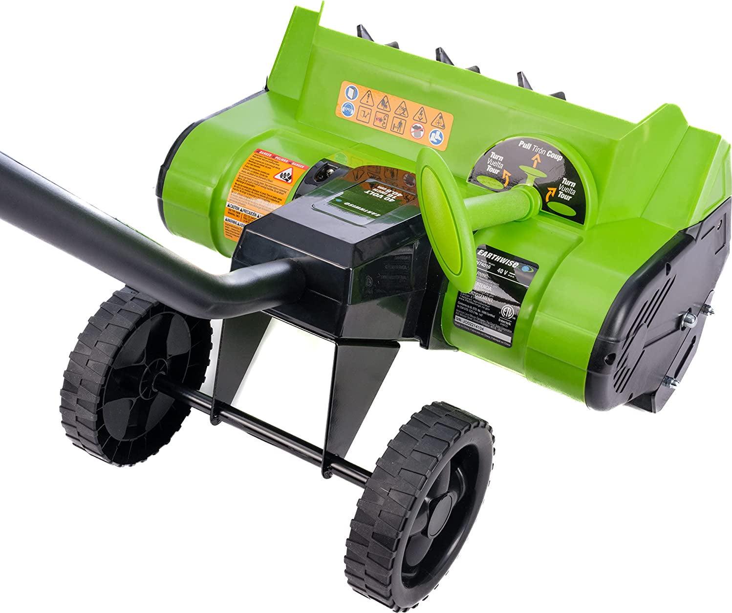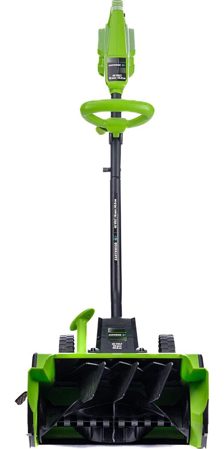 – This Earthwise Cordless 40 Volt snow thrower features a push button start. 16″ clearing width and up to 8″ clearing depth