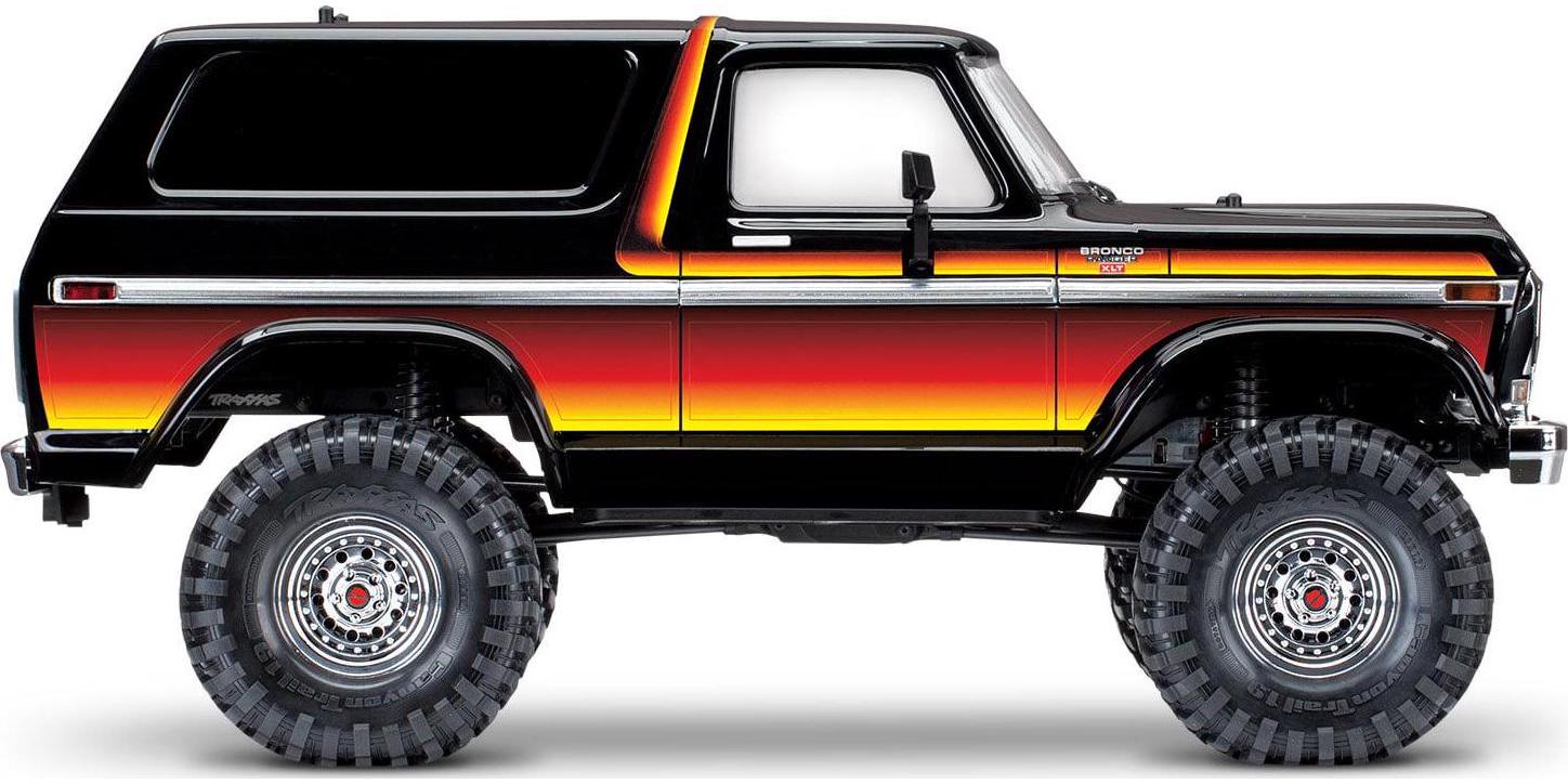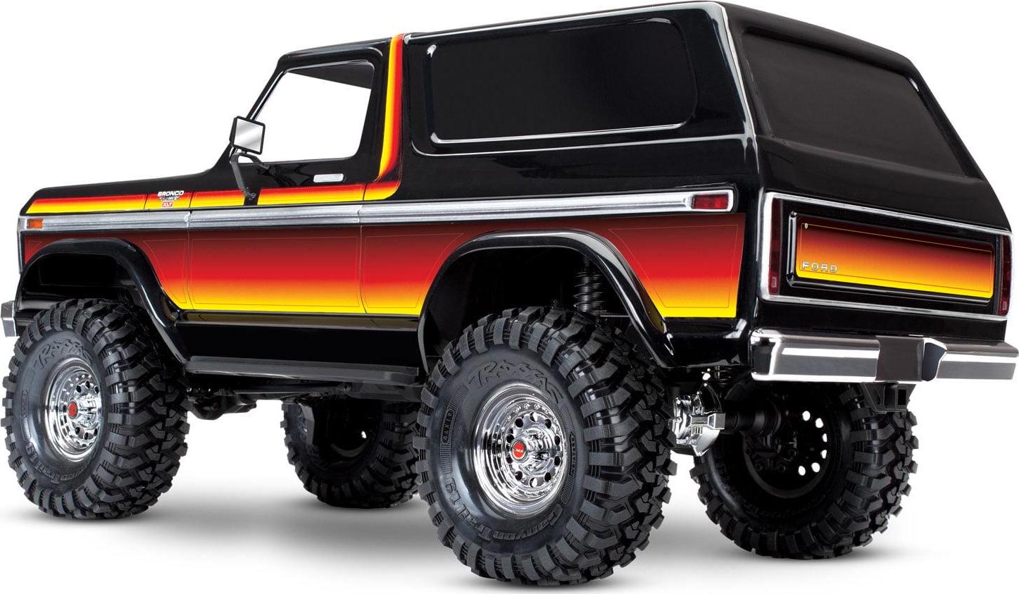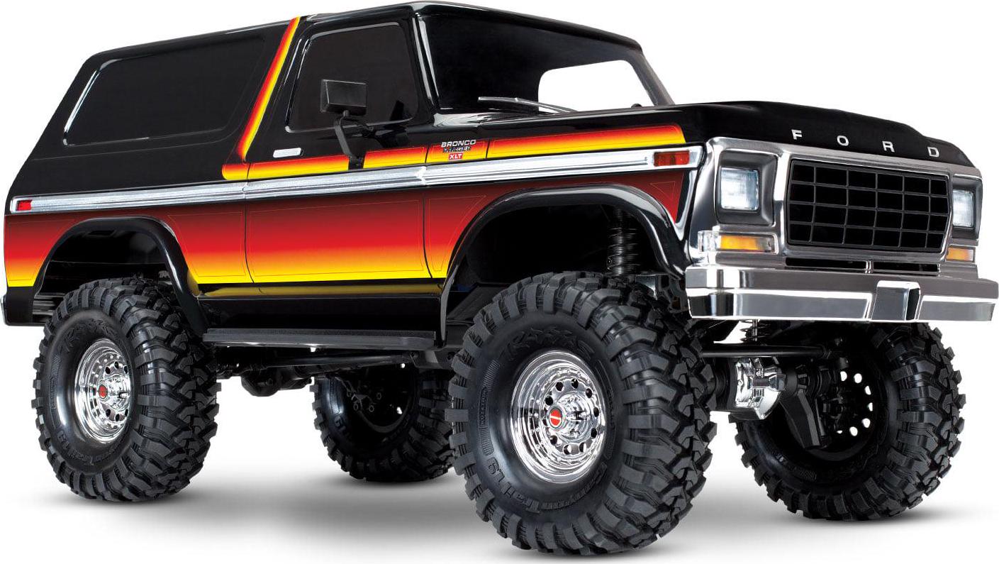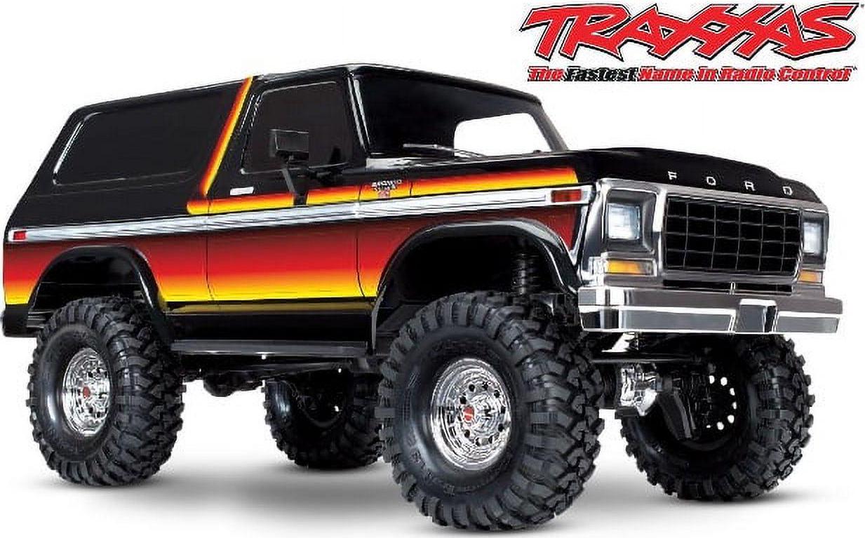 Originally introduced in 1966 as a 4×4 compact SUV. the Ford Bronco matured as a full-size truck in the late 1970s. cementing its status as a rugged off-roader. Traxxas honors the classic 1979 Ford Bronco with this beautifully detailed and faithful reproduction mounted on the incredibly capable TRX-4 chassis. From the chrome wheels and bumpers to the gorgeous Sunset or red graphics. the TRX-4 recaptures the Bronco s iconic era with the toughness and technology that could only come from Traxxas.