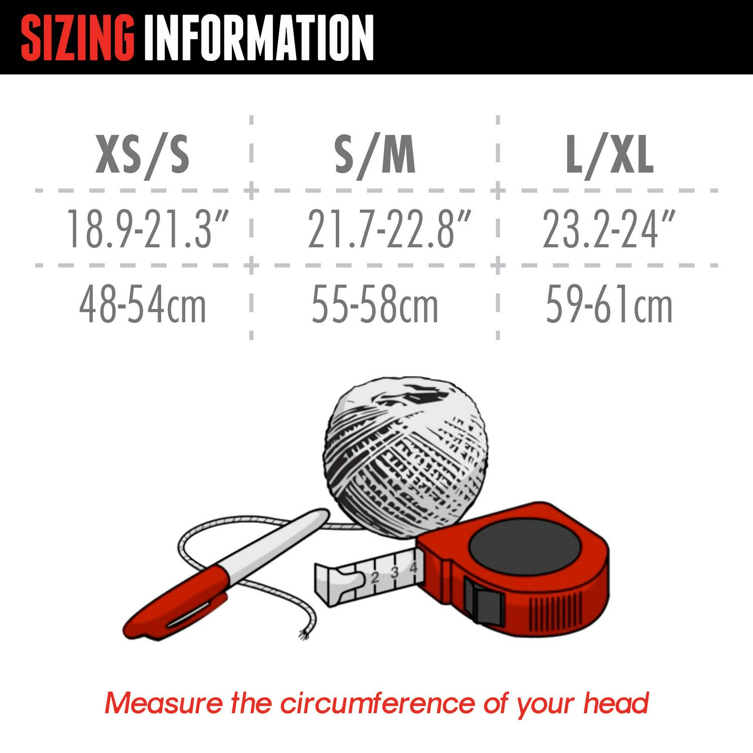 – S/M fits 21.7 22.8 in (55 58 cm)
