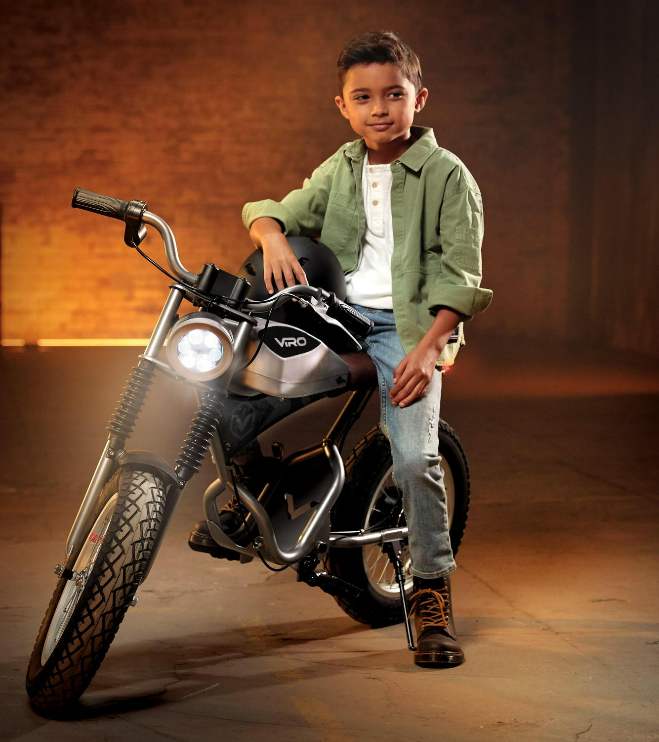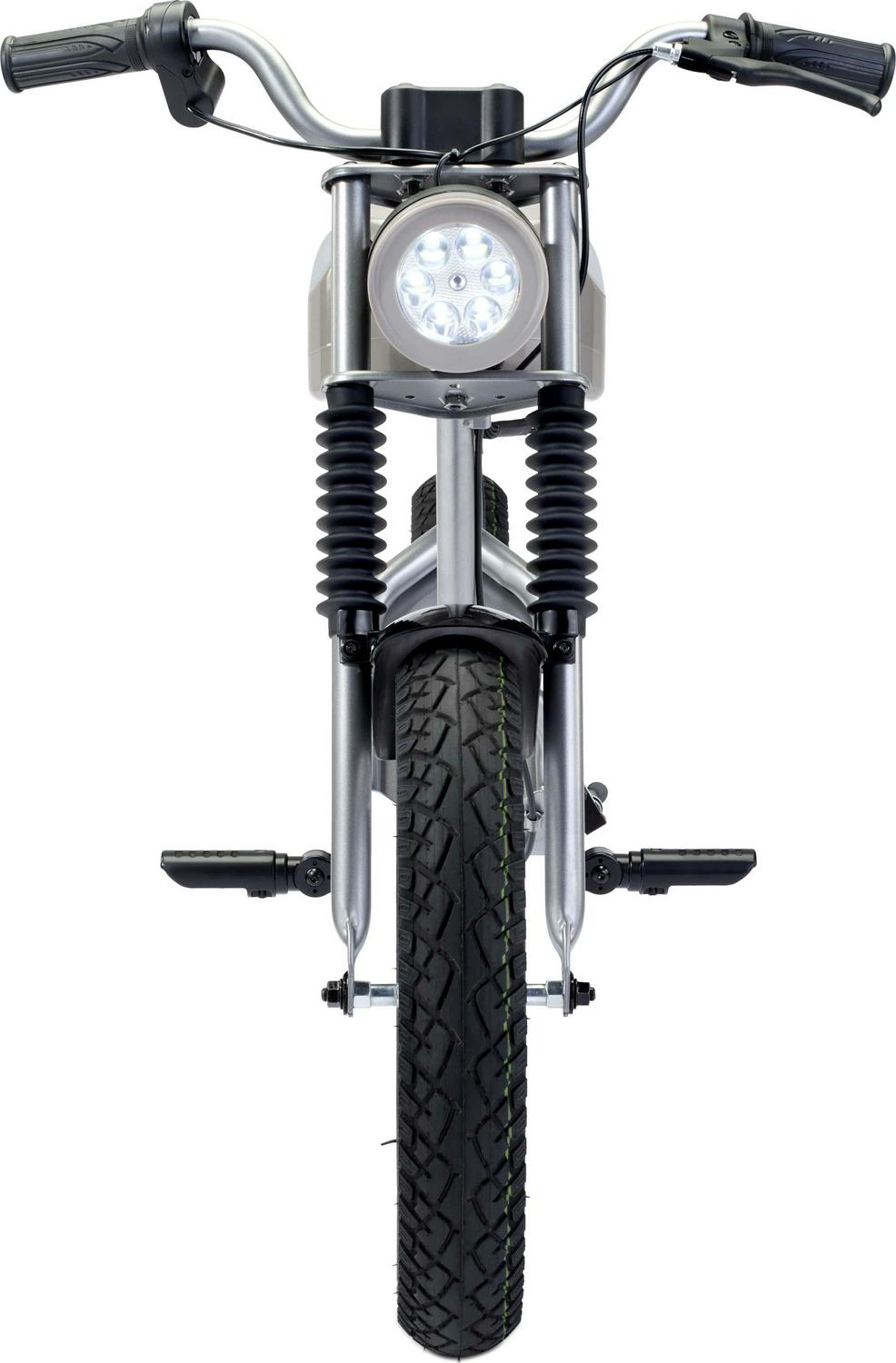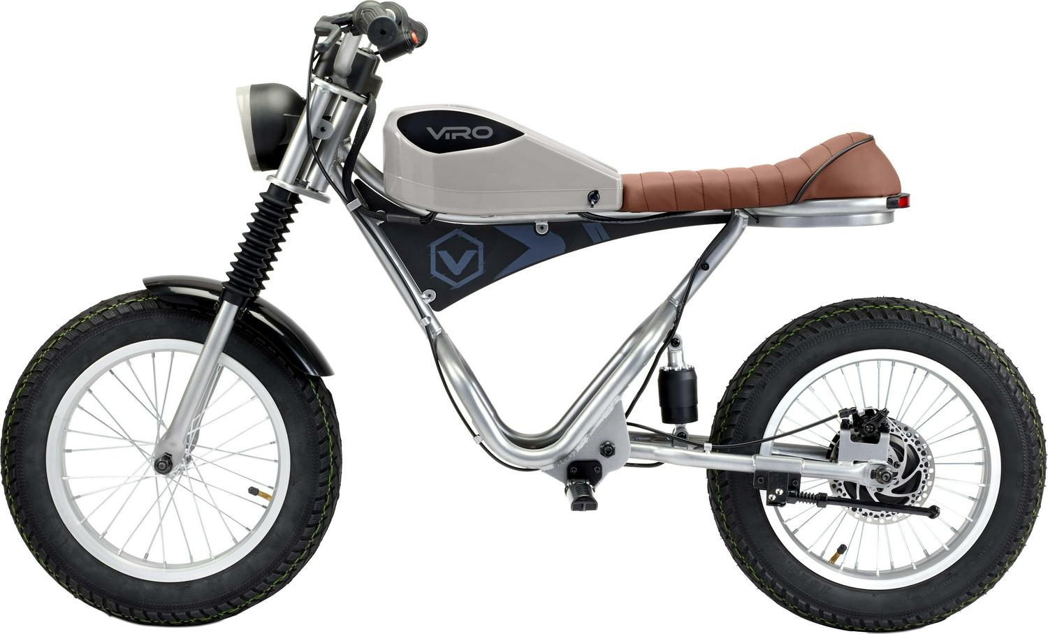 The VIRO Rides Cafe Racer is a sleek electric minibike that can reach speeds up to 15 MPH. with a 7.4 -mile range. The parent-control features allow adults to limit the speed to 10 MPH for younger or less experienced riders. The dashboard has speed and power displays. so you know how fast you are going and when it’s time for a recharge. Working front and rear LED lights help keep you safe. coming or going. The simple twist throttle revs up the 25.2-volt motor. sending power to the 250-watt rear hub wheel.