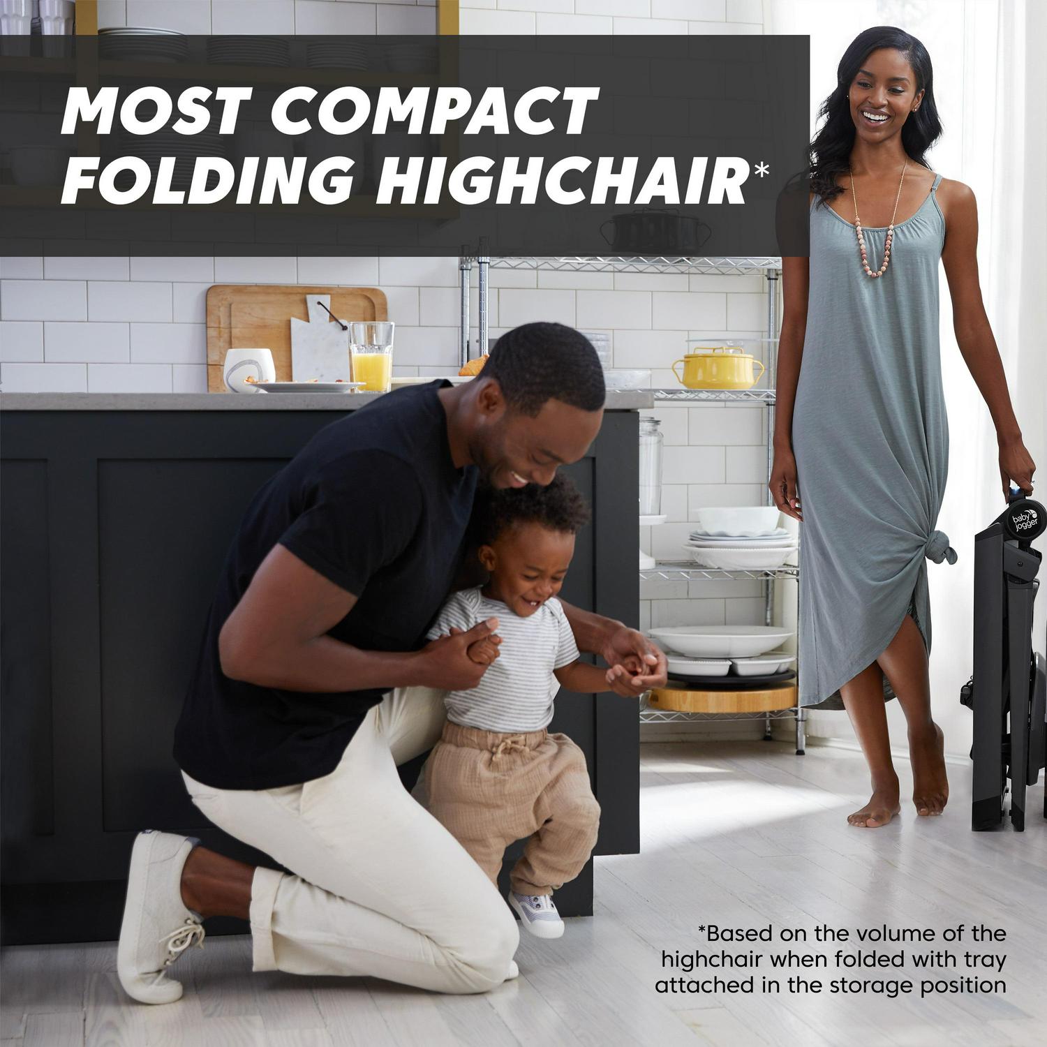 Take back your kitchen with the City Bistro High Chair. the most compact folding high chair*. perfect for families looking for a sleek and slim high chair that quickly folds away for storage in the smallest of spaces. The City Bistro High Chair folds down into a self-standing fold that is 80% smaller than when unfolded. The tray simply clips onto the back of the high chair to keep all the pieces together while folded. and the tray insert can be placed in the dishwasher for cleaning. With 4 different height positions. this high chair will grow with baby and provides added comfort with a plush. premium seat pad for children up to 40 lb. The machine-washable. stain-resistant removable fabrics make cleanup a breeze. Bonus: It’s ready to go out of the box. no additional assembly required. (*Based on the volume of the high chair when folded with tray attached in the storage position)