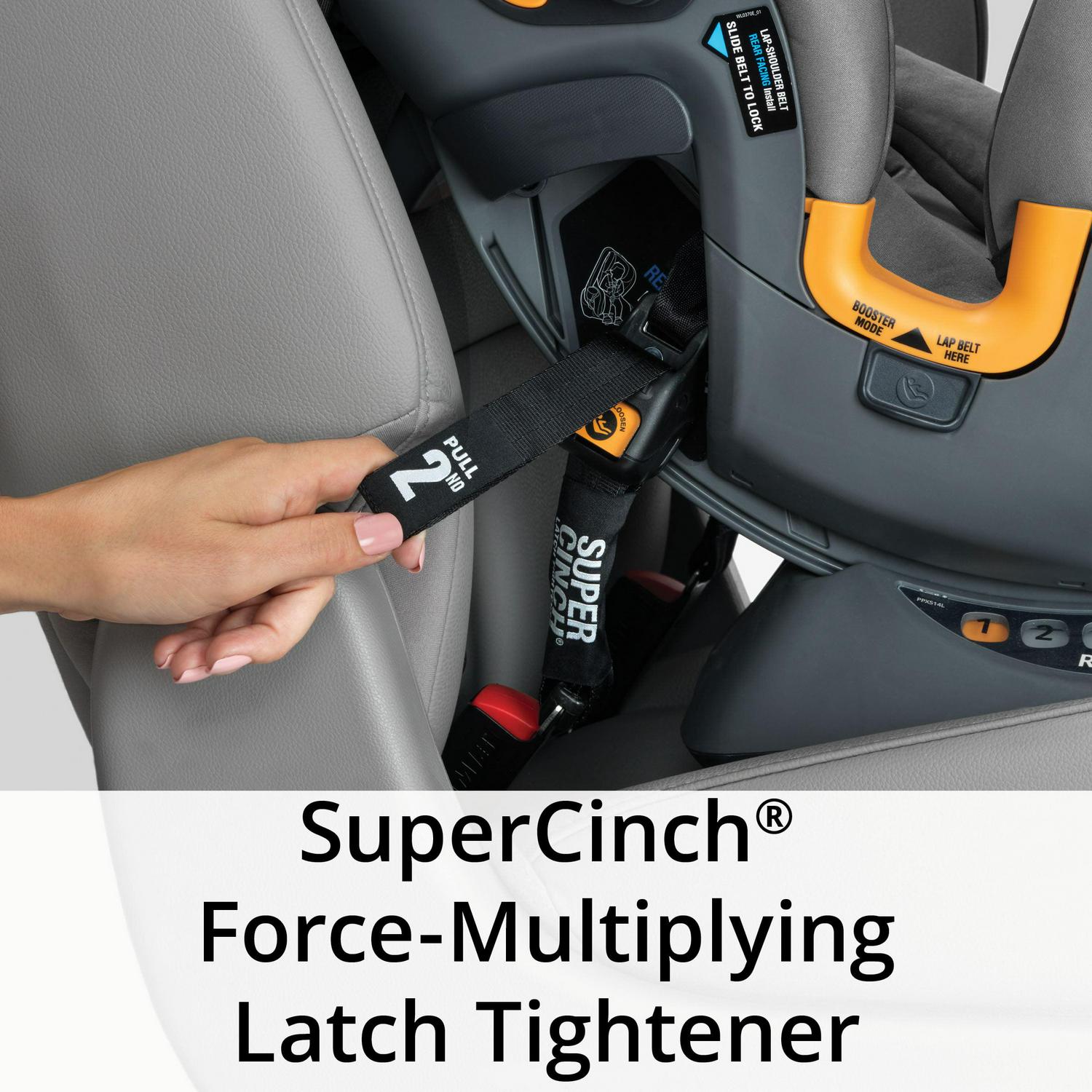 Chicco-exclusive installation features including ReclineSureTM leveling system. RideRightTM bubble levels. force-multiplying SuperCinch LATCH tightener and LockSure belt-tightening system combine to make Fit4 the easiest all-in-one car seat to install correctly. Slim design and space-saving CupFolders make the seat easy to fit and secure inside your vehicle.