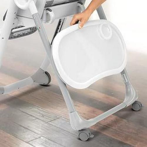 – Snap-on high chair/booster tray includes removable liner and stores on rear legs