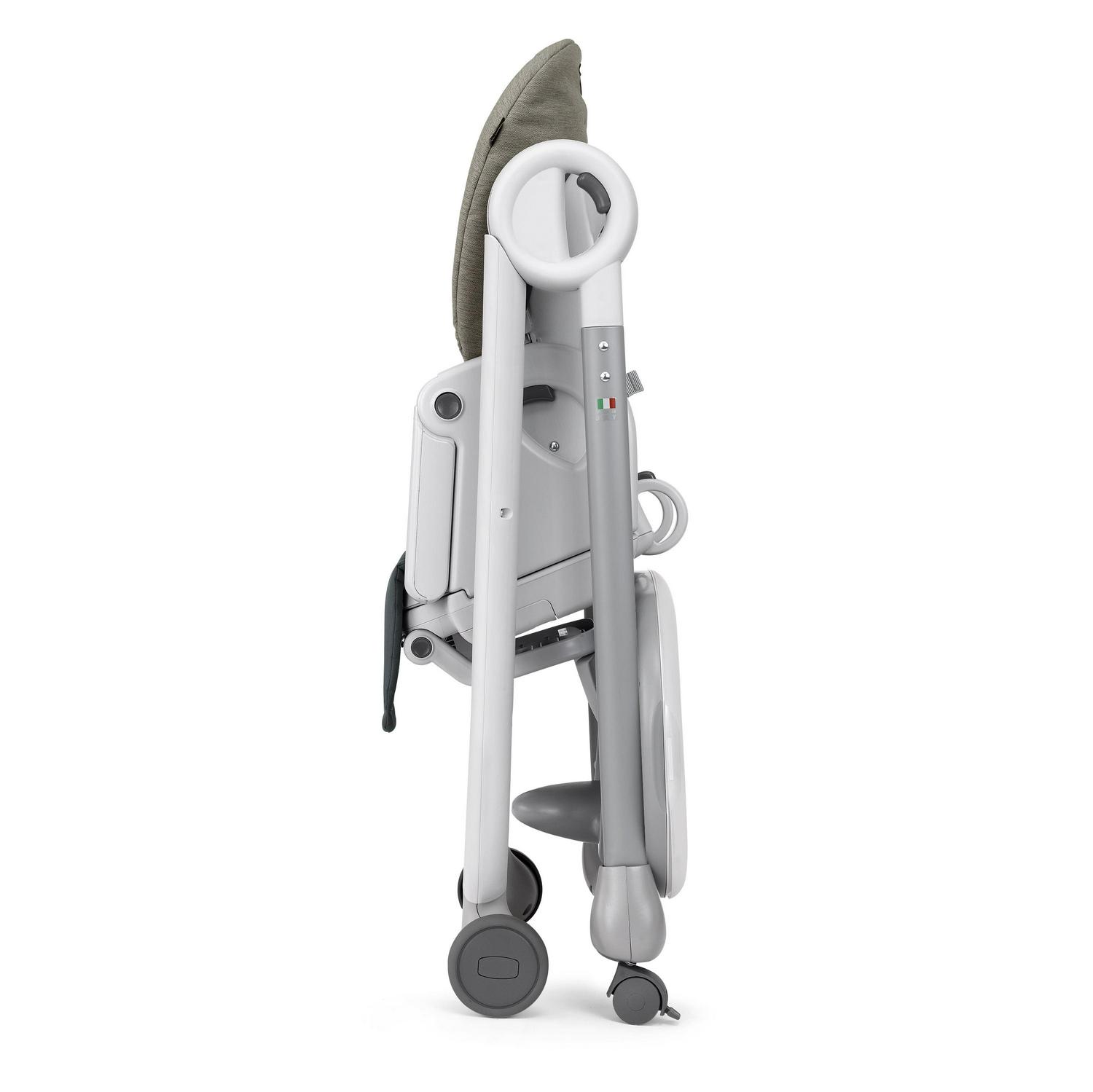 Designed for use in the Infant High Chair and Toddler Booster modes. the tray snaps easily onto the armrests for mealtime and slides onto the rear legs for storage. It also includes a removable liner for easy cleaning. For added convenience. the Progress has non-marking. guiding front wheels and rear locking swivels. A space-saving 11.5″ fold stows away conveniently for compact storage between meals.