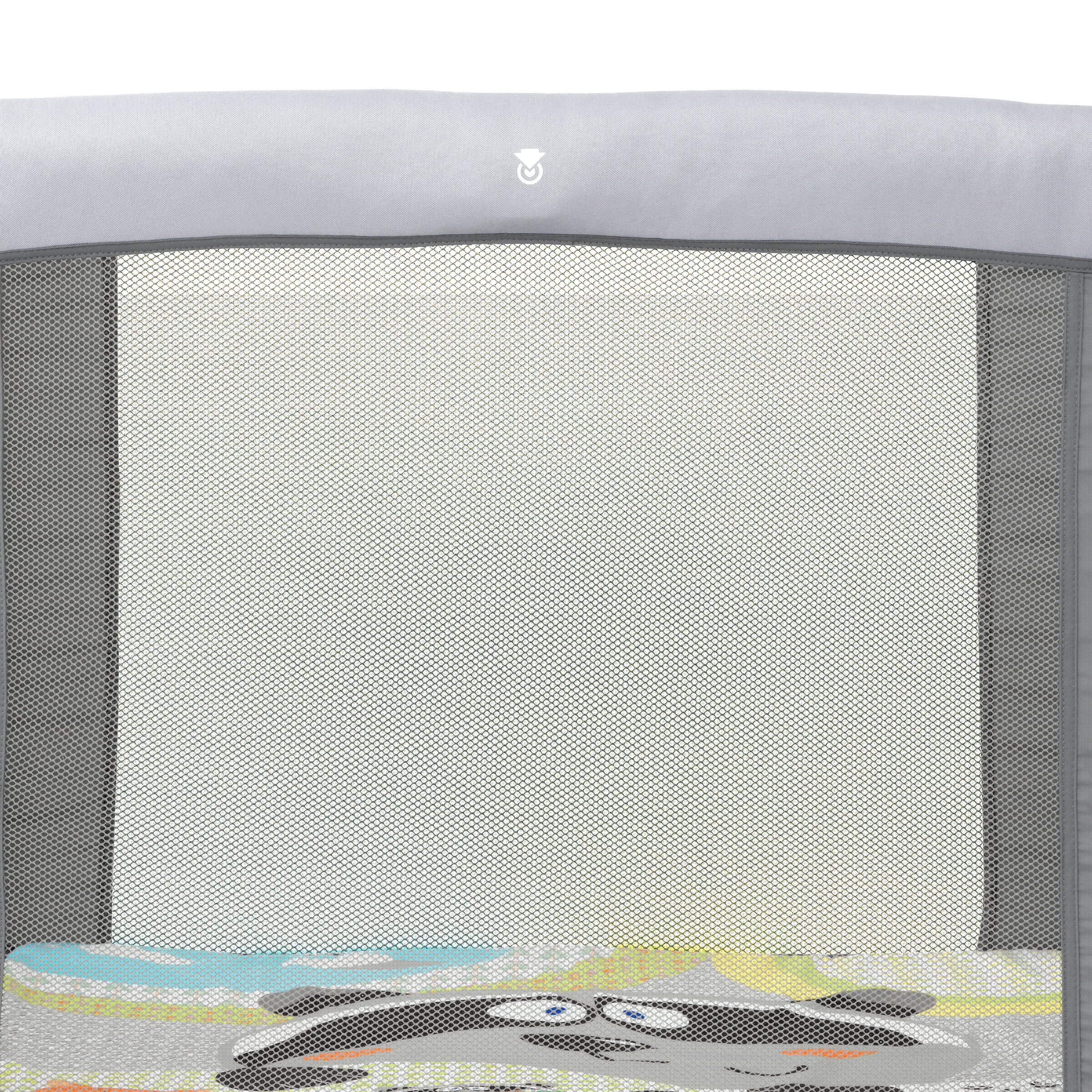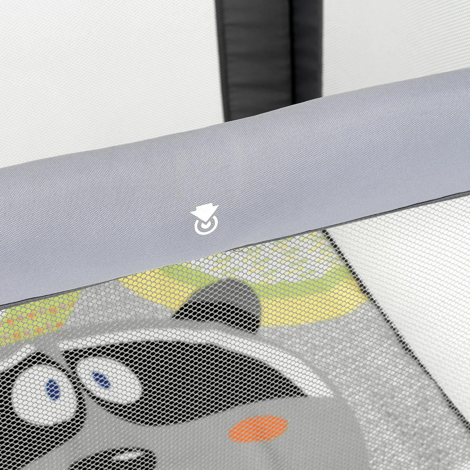 The Tot Quad playard boasts large. breathable mesh sides that provide visibility and ventilation. The padded mattress includes a removable and machine washable cover for easy cleanup. while the colorful design engages and encourages play.