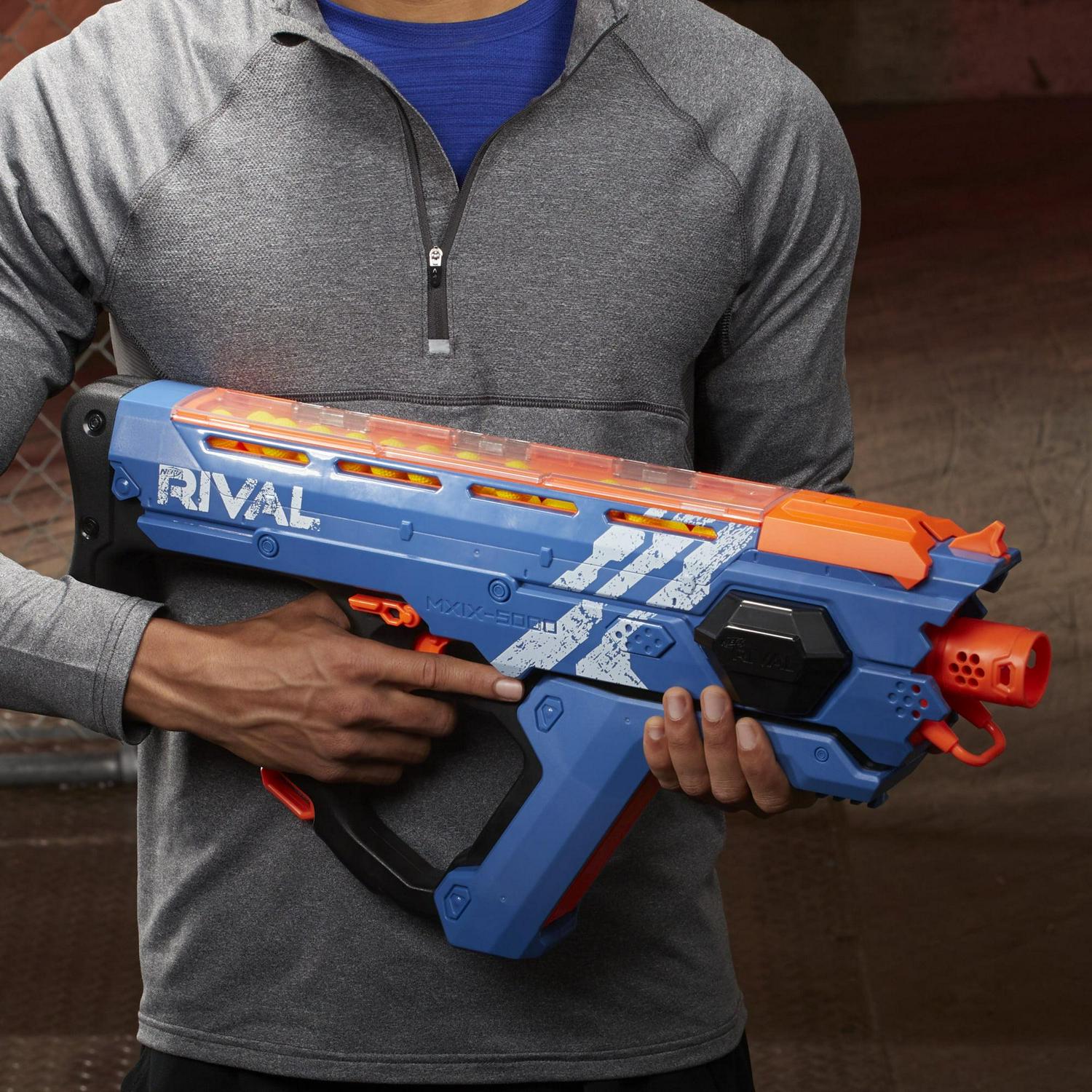 Experience the intensity of fully motorized. 50-round blasting with the Nerf Rival Perses MXIX-5000 blaster. This blaster features the fastest blasting Nerf Rival system. so rev up the motor and rapid-fire up to 8 rounds per second* to blanket the competition with a hailstorm of firepower! It includes a 9.6 volt 1200mAH rechargeable battery and wall charger. so there’s no need to stock up on batteries. The Perses MXIX-5000 toy blaster comes with 50 Official Nerf Rival high-impact rounds. enough to fully load the blaster’s high-capacity. easy-load hopper. Hold down the acceleration button to power up the motor then pull the trigger to fire. The trigger lock prevents accidental firing.