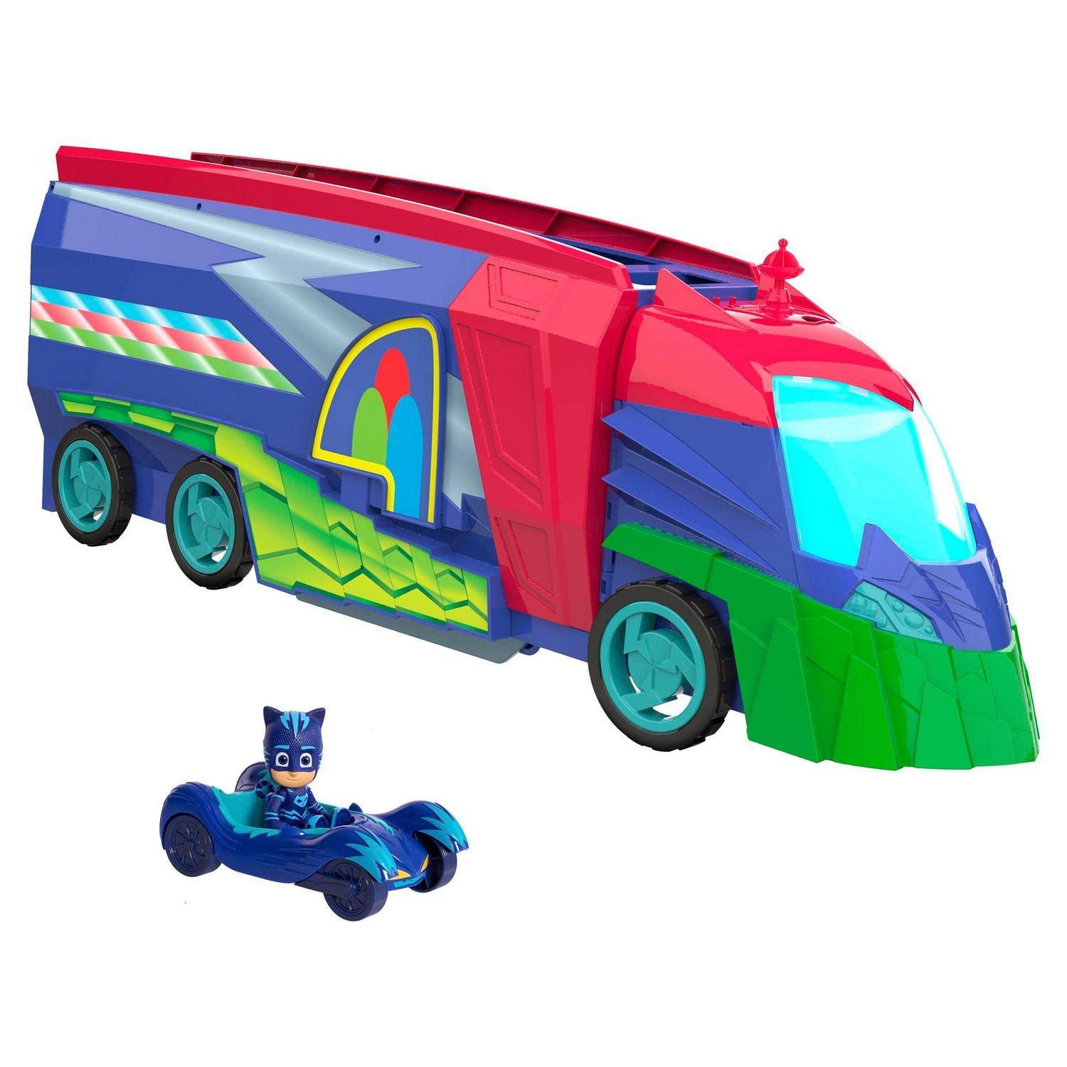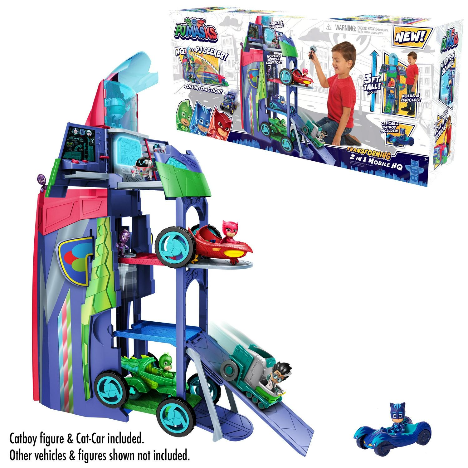 The PJ Masks are on their way. into the night to save the day with the PJ Masks Transforming 2 in 1 Mobile HQ. Kids will love recreating their favorite episodes by transforming the PJ Masks Headquarters into the PJ Seeker. As the Headquarters. the Mobile HQ stands 3-feet tall and features five levels of play. Kids can use the lights and sounds control board on the fourth level to find their mission. just like the PJ Masks! Is it Romeo. Luna Girl. or Night Ninja causing mischief this time It s time to be a hero. Use the vehicle lift to transport Gekko. Owlette. and Catboy to their level of the Headquarters; each level features a drop-down ramp. Take off into the night with Owlette s drop-down fly-pad. Perfect for taking off and landing. this compact ramp makes it easy to spot the Nighttime Villains from the sky. The second level features a drop-down ramp for when the PJ Masks need to make a quick pursuit in the Cat-Car. Kids will love pulling out the ramp and quickly sending Catboy into the night to defeat Romeo. Gekko can slip into the night to save the day with his ground level exit ramp and swim undetected to capture the villains. Bring the Nighttime Baddies back to Headquarters and use the flip-up ladder to place them in cage. Transform the Headquarters into the Seeker by folding up each ramp and placing the playset on its wheels. The Mobile HQ s wheels really roll. and kids will love driving off to save the night with the PJ Masks. The PJ Masks 2 in 1 Mobile HQ can fit up to three PJ Masks vehicles in Seeker form. The PJ Masks 2 in 1 Mobile HQ includes one articulated Catboy figure and one Cat-Car; all other vehicles and figures are sold separately. Requires 2 x AAA batteries (not included). Ages 3+