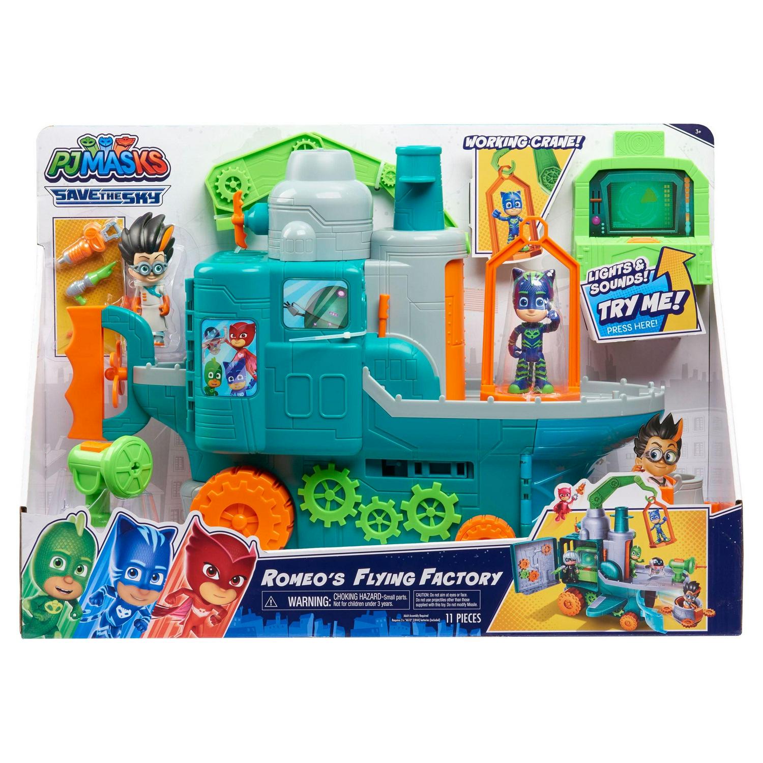 Just like in the popular preschool show. PJ Masks. Romeo is getting ready to rule the sky with the Romeo’s Flying Factory Playset! Romeo’s Flying Factory can really roll and opens to reveal a secret lair! The playset includes a lights and sounds control panel. working crane. laser launcher. drone. and two of Romeo s greatest gadgets. The Squashatron & The Sniff-O-Whiff! It even features lots of fun gears. wheels. and handles that kids will have fun pretending to control the Flying Factory with. Romeo can use the control panel to plot his mad-scientist schemes and then shoot his laser launcher when the PJ Masks come to stop him! Look out for the kid-powered crane. Romeo is trying to capture Catboy! Sensing defeat. Romeo gets into his get-a-way drone hidden inside the bottom compartment in his Flying Factory. Pull the wings back and the Factory will launch Romeo and his get-a-way vehicle! Has Romeo escaped again. or will the PJ Masks finally be able to capture and defeat this mad-scientist Romeo s Flying Factory Playset includes: one Flying Factory. one 3 Catboy articulated figure. one 3 Romeo articulated figure. one lights and sounds control panel. one rolling get-a-way drone vehicle. and two of Romeo s invention accessories. Requires 3 x AG13 batteries (included). Ages 3+