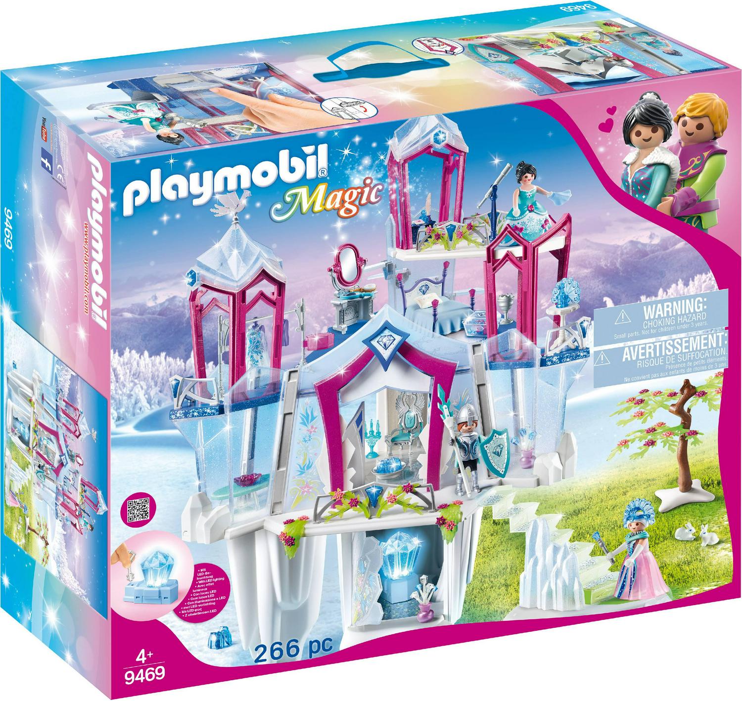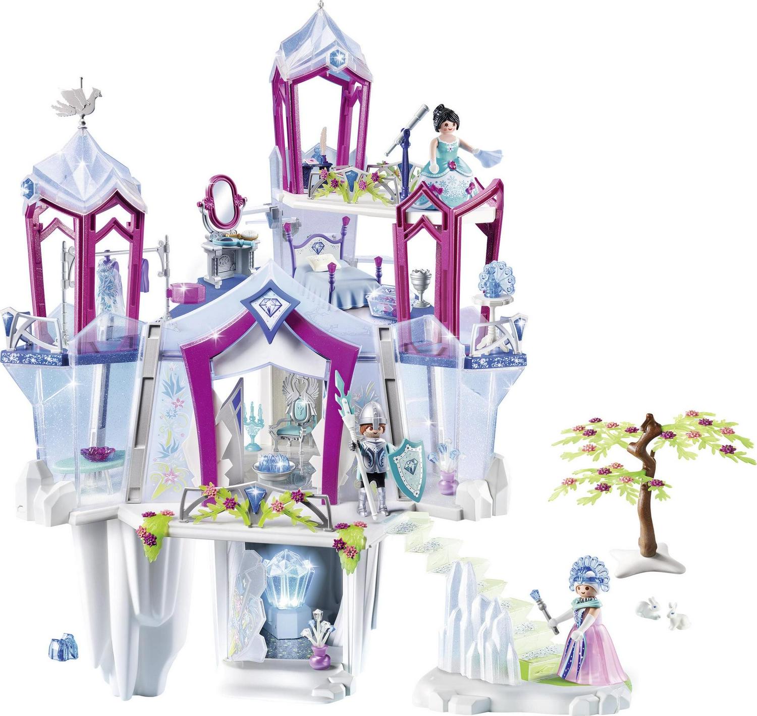 Set off on a dazzling adventure as you explore the Crystal Palace of the Winter Kingdom! In this incredible world. visitors will find a little magic and mystery. As they approach the front gates. lift the gemstone shield to lower two magical icicles and block their entry until the guards determine if the visitor is a friend or foe. Friends can then enter the palace and meet with the royal family on the main floor. The queen sits upon her throne while magical lights flicker up through the ice floor. a result of the illuminating crystal sparkling in the palace cave below (3 x AAA batteries required). When finished greeting visitors. the royal family can ascend to their private apartment via the spiral ice staircase. Fully furnished with a luxurious bed. rocking chair. vanity. and dressing room. the princess chamber has everything she needs. Depending on her mood that day. the princess can select whichever outfit suits her best. Keep an eye on the magical hoop skirt though! It changes patterns in the cold. When the princess wants to sneak away to a quiet place. she can lower the hidden ice steps outside her bedroom and climb up to the palace tower. There. she can look out over her icy kingdom with the help of the telescope. Set includes the figures. throne. interchangeable outfits. bed. rocking chair. bejeweled scepter. rug. candelabra. vanity. ice flowers. love letter. quill. magical key. and lots of other accessories. Dimensions: 17.7 x 25 x 26 in (LxWxH). Recommended for ages four years and up. Warning. Choking Hazard. Small parts. Not for children under 3 years.