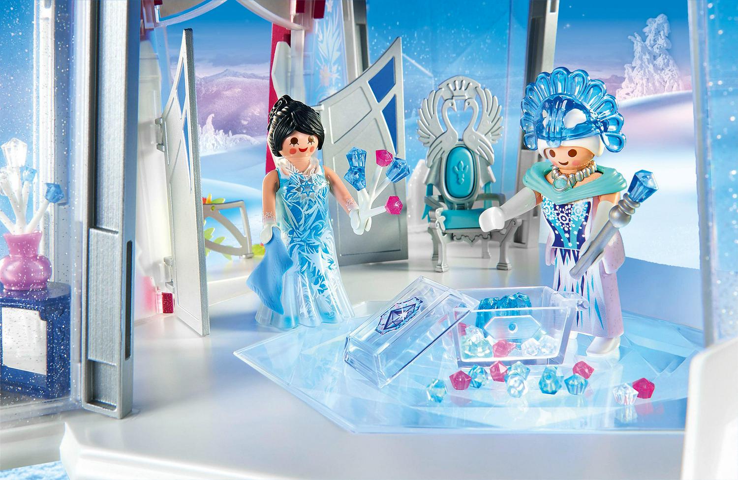 – Set includes the figures. throne. interchangeable outfits. bed. rocking chair. bejeweled scepter. rug. candelabra. vanity. ice flowers. love letter. quill. magical key. and lots of other accessories