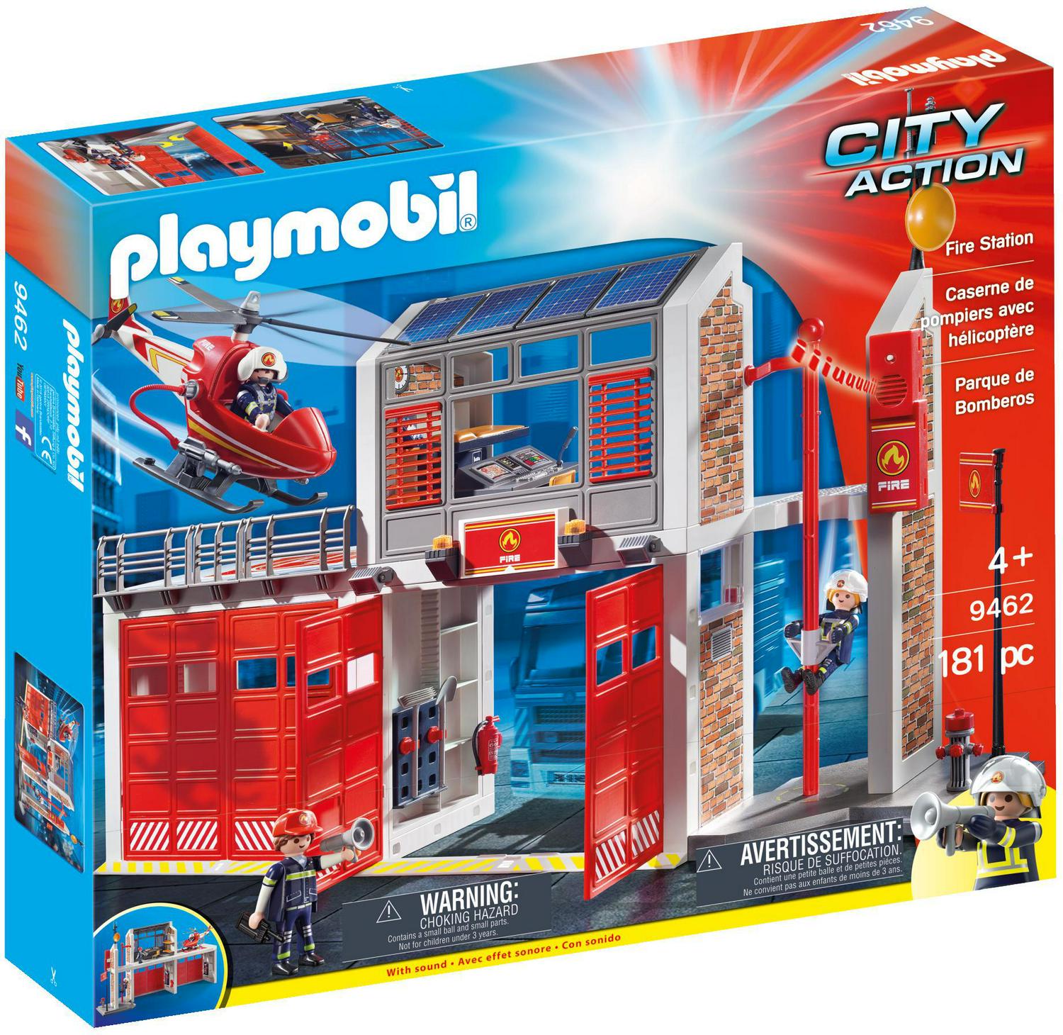 Fight fires around the clock at the Fire Station. This station comes with all the equipment necessary for small and large emergencies! Use the control center to monitor all incoming emergencies. When the functioning alarm sounds. quickly slide down the pole to get to the fire quickly or head out to the helipad to fly to the scene. The firefighting helicopter is on its way to fight the fire from above. You can store your fire vehicle in the garage. once the emergency is over. and head upstairs to the fold-down bunk beds to rest. Set includes two figures. helicopter. helmets. megaphone. flashlight. fire extinguisher. and other accessories. Dimensions: 24 x 8.3 x 14.2 in (LxWxH). Recommended for ages four years and up. Warning. Choking Hazard. Contains a small ball and small parts. Not for children under 3 years.