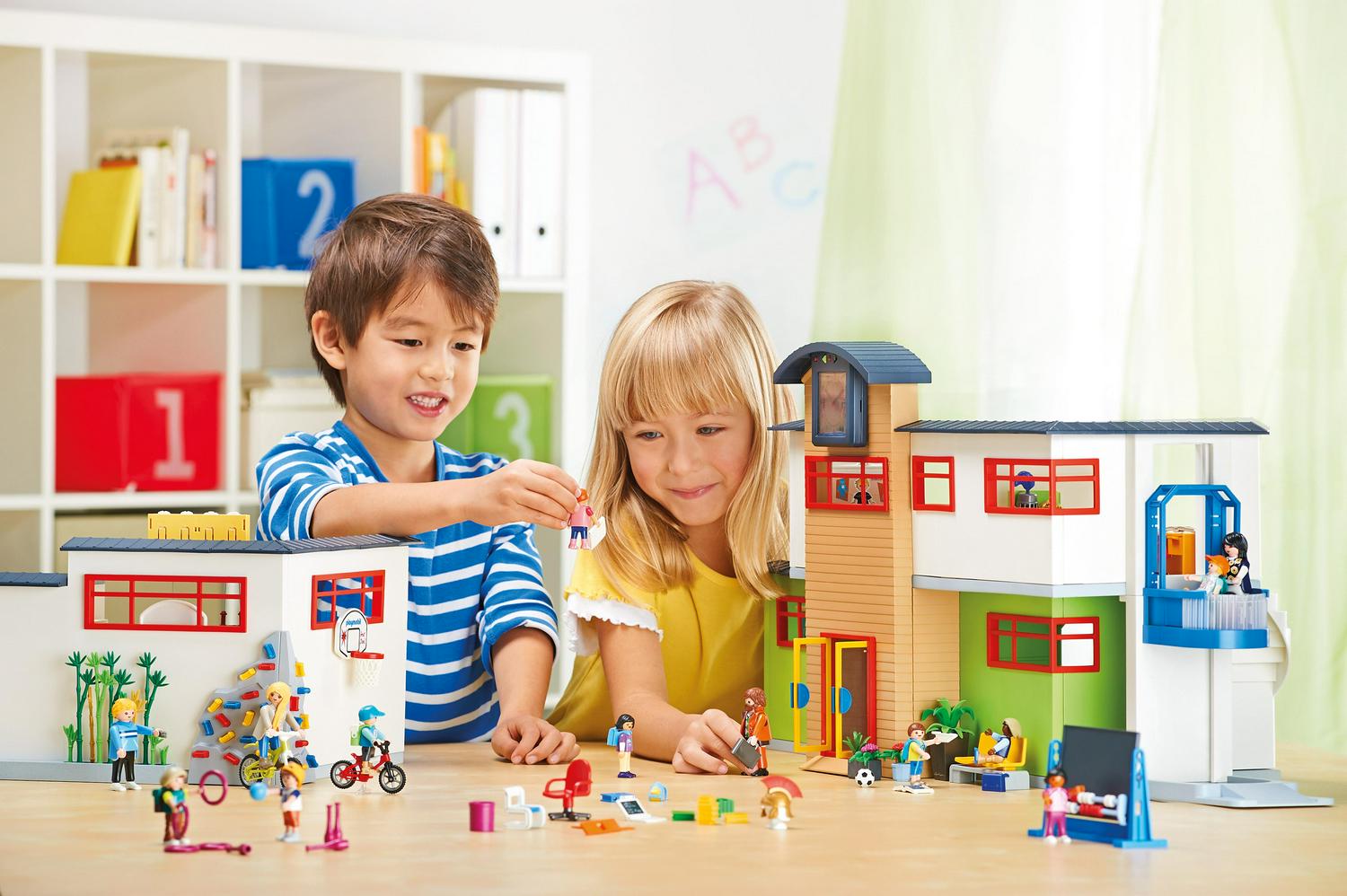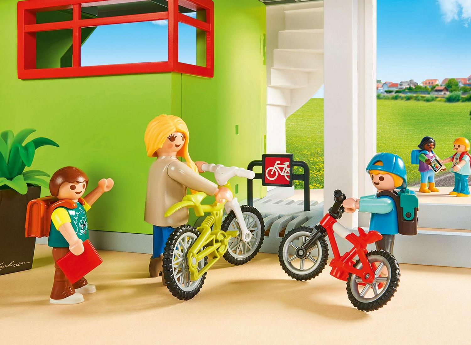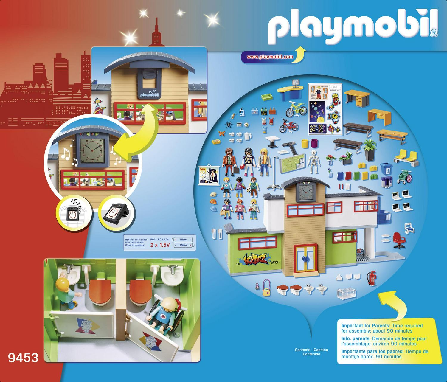 Classes are in session at the Furnished School Building. Upon arriving. students can ind storage for all their school supplies in the downstairs lockers. before heading to their first class of the day. Then. with the help of the functioning digital clock with school bell. students can make sure they get to class on time. Those unable to take the stairs can use the functioning elevator to get to classes on the second floor. The elevator. along with the access ramp and larger bathroom stalls. make this school wheelchair friendly. The downstairs room is a fully-equipped biology classroom with a skeleton model. bio charts. and encased spider for studying. Upstairs. students will find a computer lab and teacher s office. Combine this set with the rest of the PLAYMOBIL School theme (#9453-9457 sold separately). for even more fun. Set includes three adult figures. six child figures. functioning clock with school bell. desks. backpacks. bicycles. laptops. chairs. classroom charts. books. skeleton. wheelchair. toilets. sinks. and tons of other accessories. Dimensions: 29.9 x 14.1 x 14.5 in (LxWxH). Recommended for ages five years and up. Warning. Choking Hazard. Contains a small ball and small parts. Not for children under 3 years.
