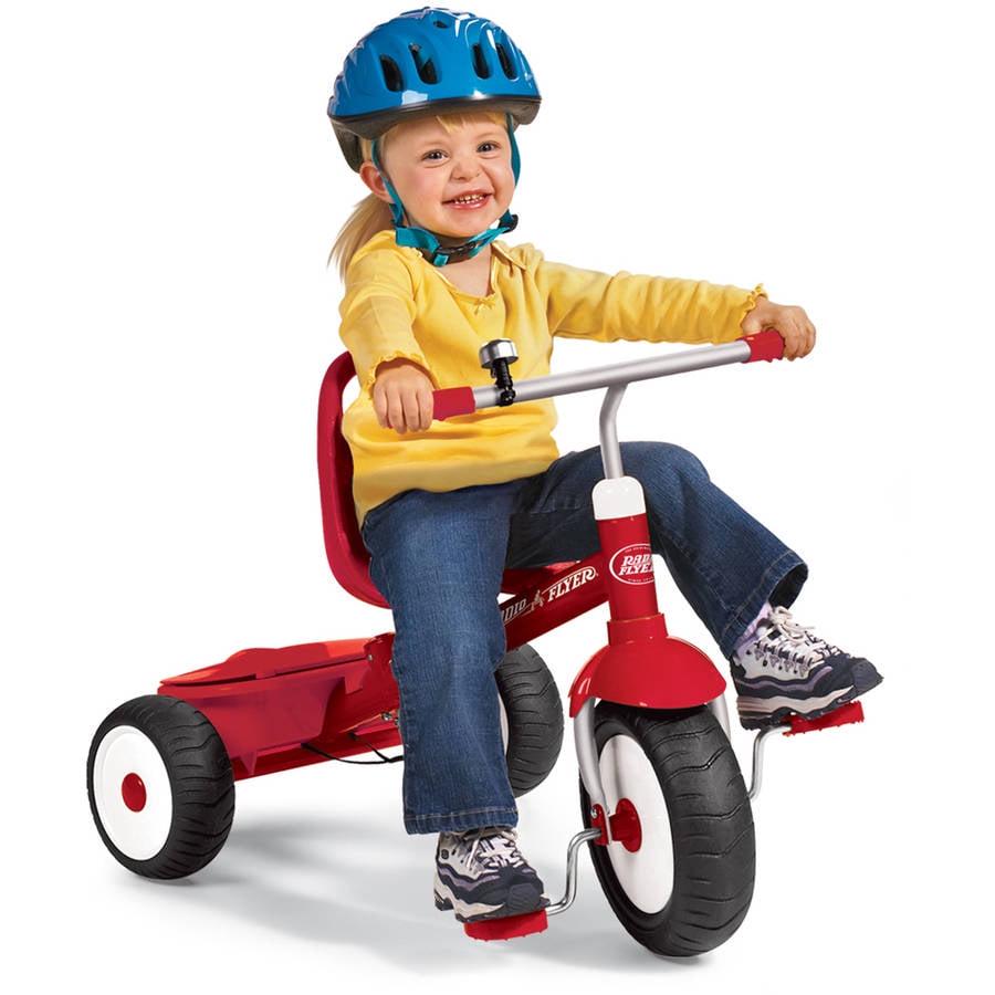 Take your child for a ride on the Radio Flyer Deluxe Steer & Stroll Trike! This unique tricycle design offers a dual riding concept. fit for beginners and more confident little ones. Our innovative pedal mechanism allows riders to rest their feet on the pedals and enjoy the ride while adults control the push and steer functions. For kids ready to ride alone. the adjustable push handle will come off easy! Your little one will be zooming away in no time. The trike also features durable molded wheels. an adjustable seat to grow with your child. and a solid steel frame. The fun covered storage bin is great for taking toys on the go. and chrome bell just adds more fun to the ride. For ages 2-5 years.