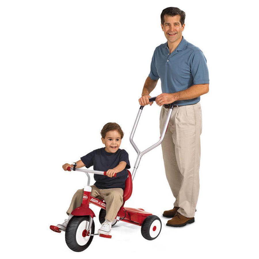 - Parent push handle steers trike for learning riders