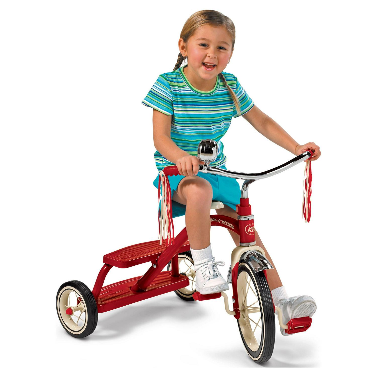 The Radio Flyer Classic Red Dual Deck TricycleTM is The One You Loved as a Kid! This sturdy trike features steel construction. spoked wheels. a 12 front wheel and real rubber tires for durability. The controlled turning radius prevents tipping for safe and confident riding. This red tricycle is classically styled and includes chrome handlebars and fender. Your child will also love the streamers and ringing bell. and the double-deck rear step makes climbing on and off easy. The adjustable seat grows with your child. For ages 2 ½ – 5 years. Maximum weight capacity 49 lbs.