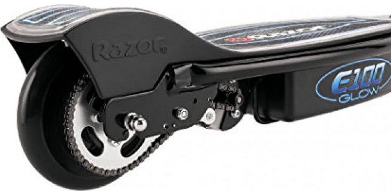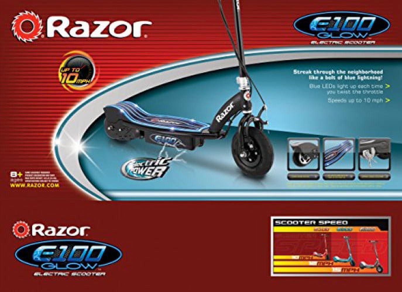 Razor E100 Glow Electric Scooter for Kids Ages 8+ and up to 120 lbs. 8 Pneumatic Front Tire. LED Light-Up Deck. 100W Chain Motor. Up to 10 mph and up to 40 mins Ride Time. 24V Sealed Lead-Acid Battery