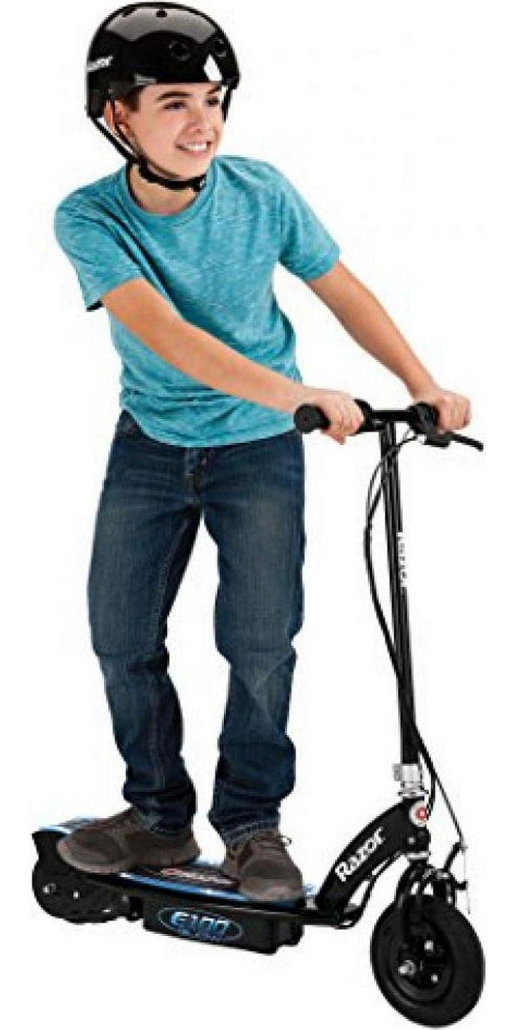 Hop on the Razor E100 Glow that shines like a bolt of blue lighting!Designed for riders age 8 and up. the E100 Glow Electric scooter features a kick-to-start. 100-watt motor that provides speeds up to 10 mph (16 km/h) just enough to thrill younger riders. Its simple twist-grip acceleration control and hand-operated brake help kids take confident control of their ride. The 8″ (200 mm) pneumatic front tire provides ample cushion to smooth out rough surfaces. With the LEDs on the deck that light up when throttle is twisted. the Razor E100 Glow electric scooter offers up to 40 minutes of fun. glowing. electric-powered ride time.Glow wherever you go. with the Razor E100 Glow!