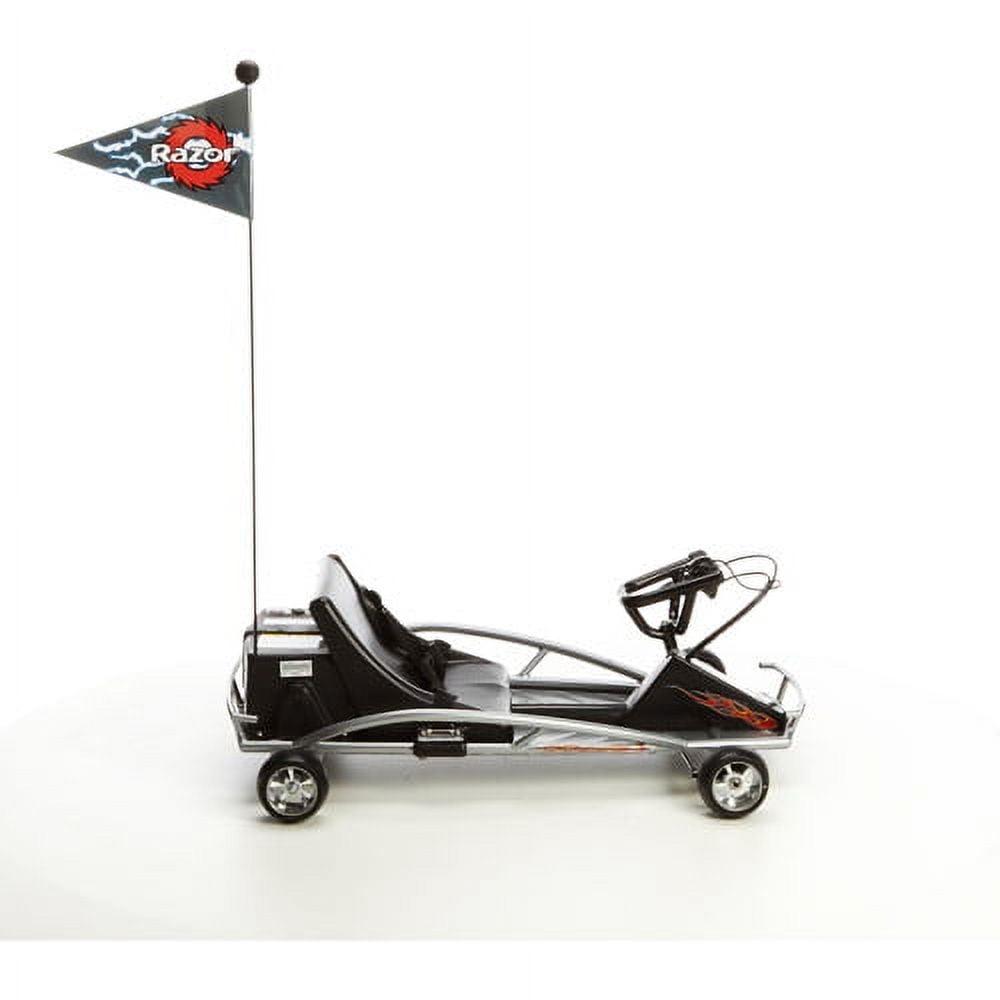 The Razor Ground Force Electric Go Kart lets you bring the fun home. Featuring a sleek silver-and-black design and classic styling. it delights all ages. It has a low-profile cast-aluminum wheels. sturdy steel construction and a rear axle for increased maneuverability steering. Reaching speeds up to 12 miles per hour. the electric-powered go-kart is a force to be reckoned with. Molded aluminum wheels and solid tires help it run smoothly wherever it goes. It is designed for users 8 years and older. This ride on go-kart is designed for zipping around flat trails or a cul-de-sac and not for use on public streets or in areas with potential traffic hazards. It has a quiet variable-speed. chain-driven motor and is powered by two 12-volt batteries. The initial charge time is 12 hours and it runs for around 40 minutes at a time. For safety. it has a hand-controlled accelerator and hand brake. A seat belt and flag are also in place.
