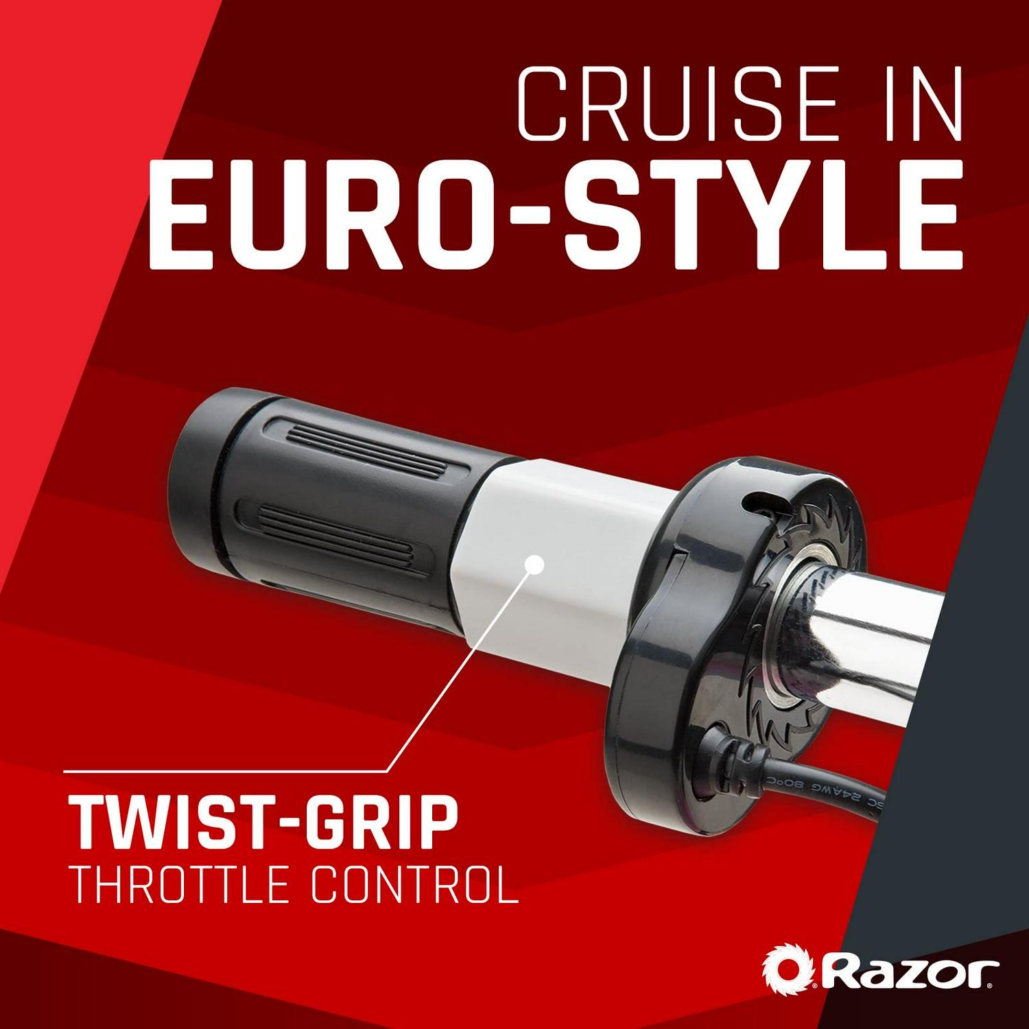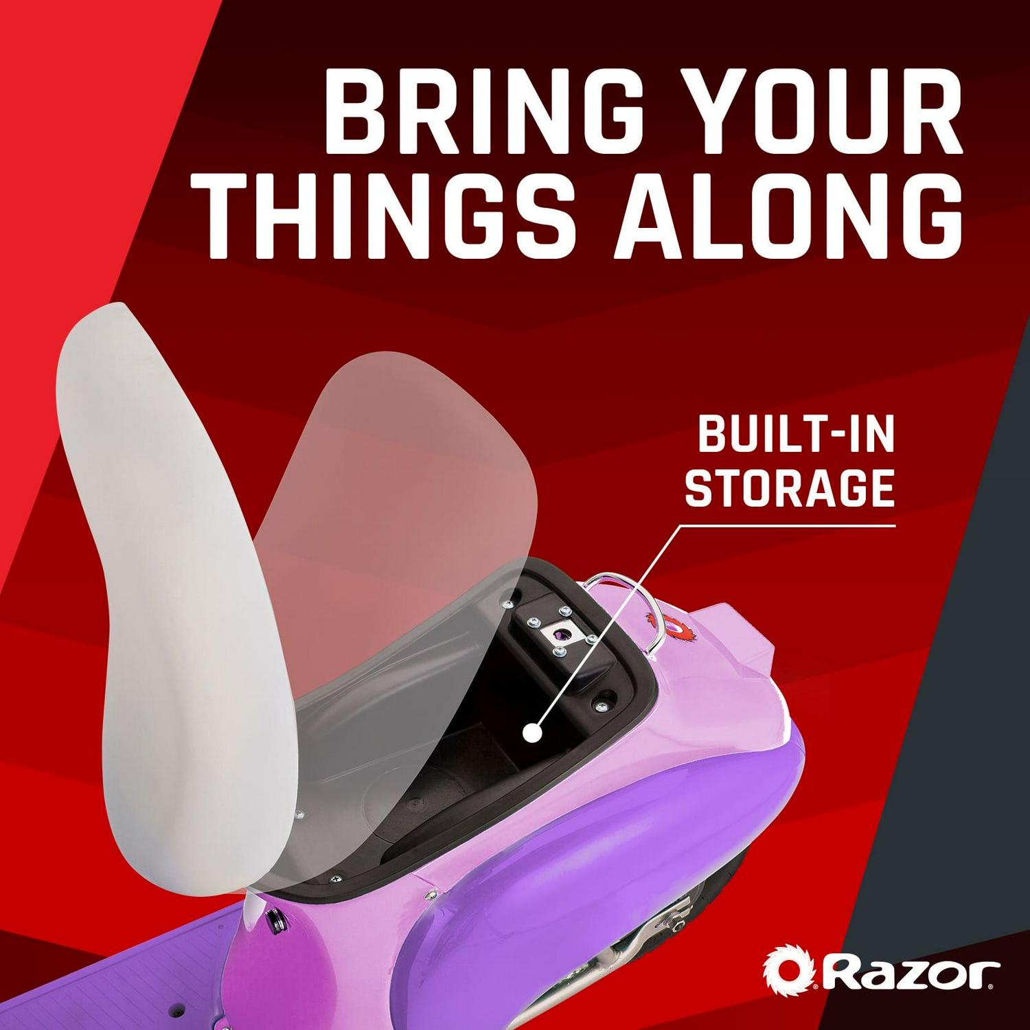 You re all about style. retro or vintage. and your color story is just as important to you as your Algebra final. With the Razor Pocket Mod miniature electric scooter. you ve got up to 40 minutes of uninterrupted ride time on a single battery charge. With speeds up to 15 mph (24 km/h). a secret storage compartment. dual kickstand. padded seat. and controls at your fingertips it all adds up to an amazing ride. so sit back. relax. and enjoy the bliss.