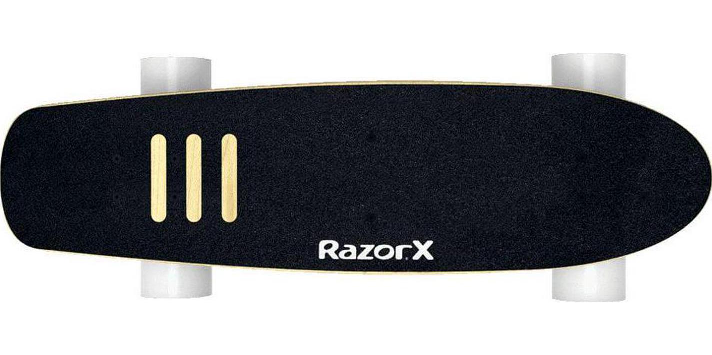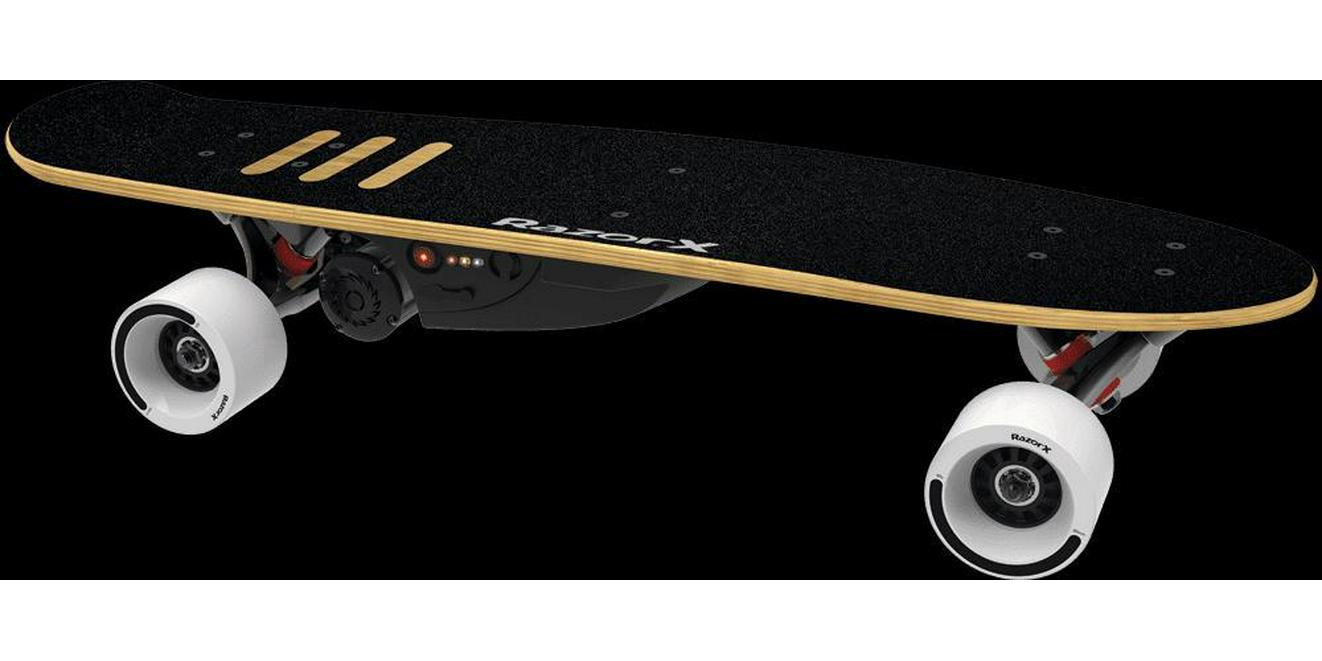 Put fun on cruise with the lithium-ion-powered electric skateboard made to zoom! The new RazorX Cruiser is a skateboard with an electrifying kick. putting the control of a 125-watt. geared motor in the palm of your hand and under your feet. This complete cruiser uses an innovative. geared. rear-wheeldrive motor and lithium-ion battery to deliver electrifying skate action at speeds up to 10 mph (16 km/h) for up to 40 minutes of continuous use. Hit your perfect cruising velocity with the variable-speed control on the wireless. digital. hand-held remote. then lean into the lithium-ion-powered. carve-and-turn action. The 29.7″ (754 mm) long. 5-ply maple deck and custom. reverse kingpin trucks deliver a smooth. responsive ride. while perforated grip tape and ground-gripping urethane wheels keep you firmly in control of your board. Our new kick-start. geared. rear-wheel-drive motor technology is virtually maintenance free. meaning you won’t have to worry about alignment issues. chain or belt.