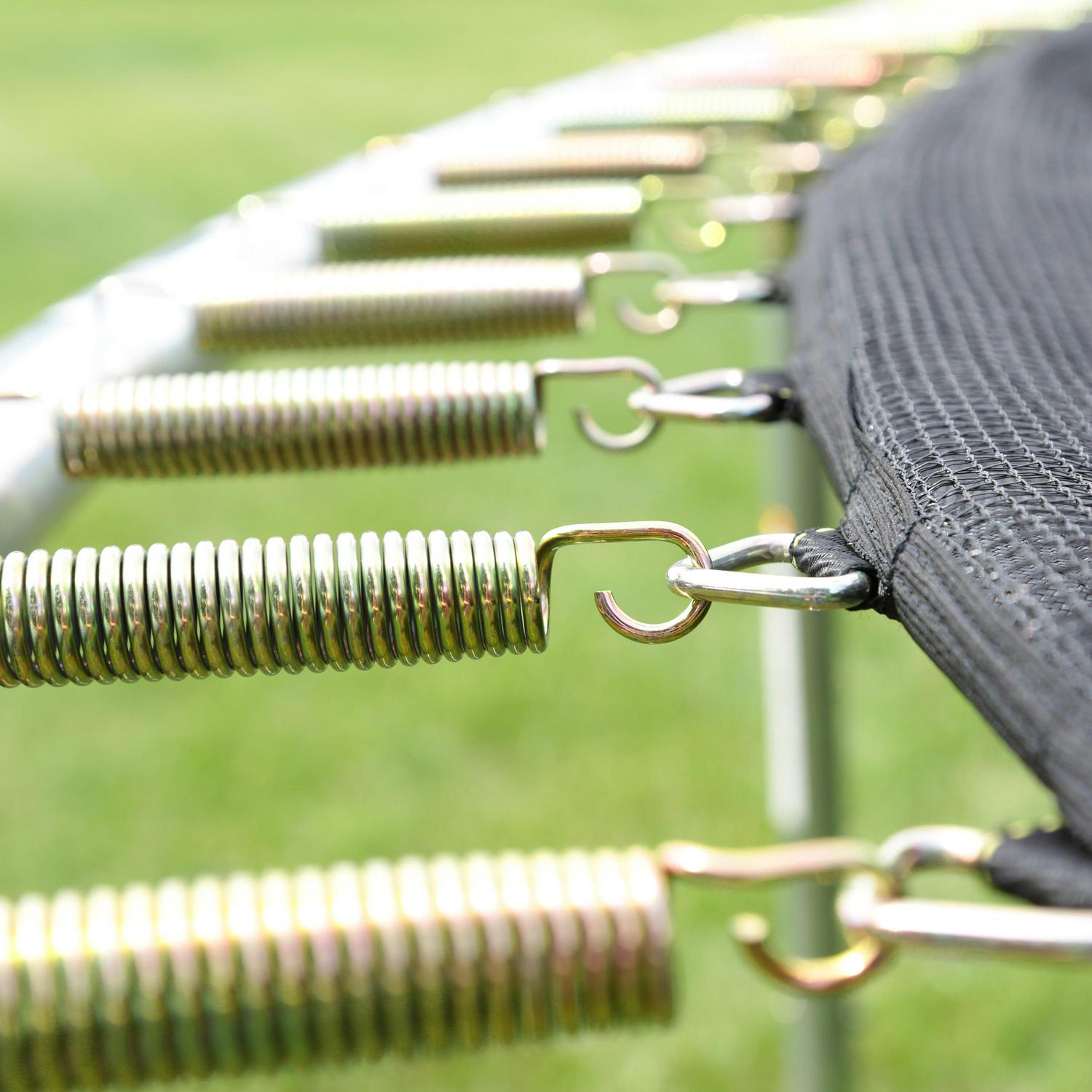 – 96 tightly-coiled springs. 6.5″ long are located around the outside of the enclosure net for added safety. Each spring is made of steel. and features a rust-resistant coating for a longer life.