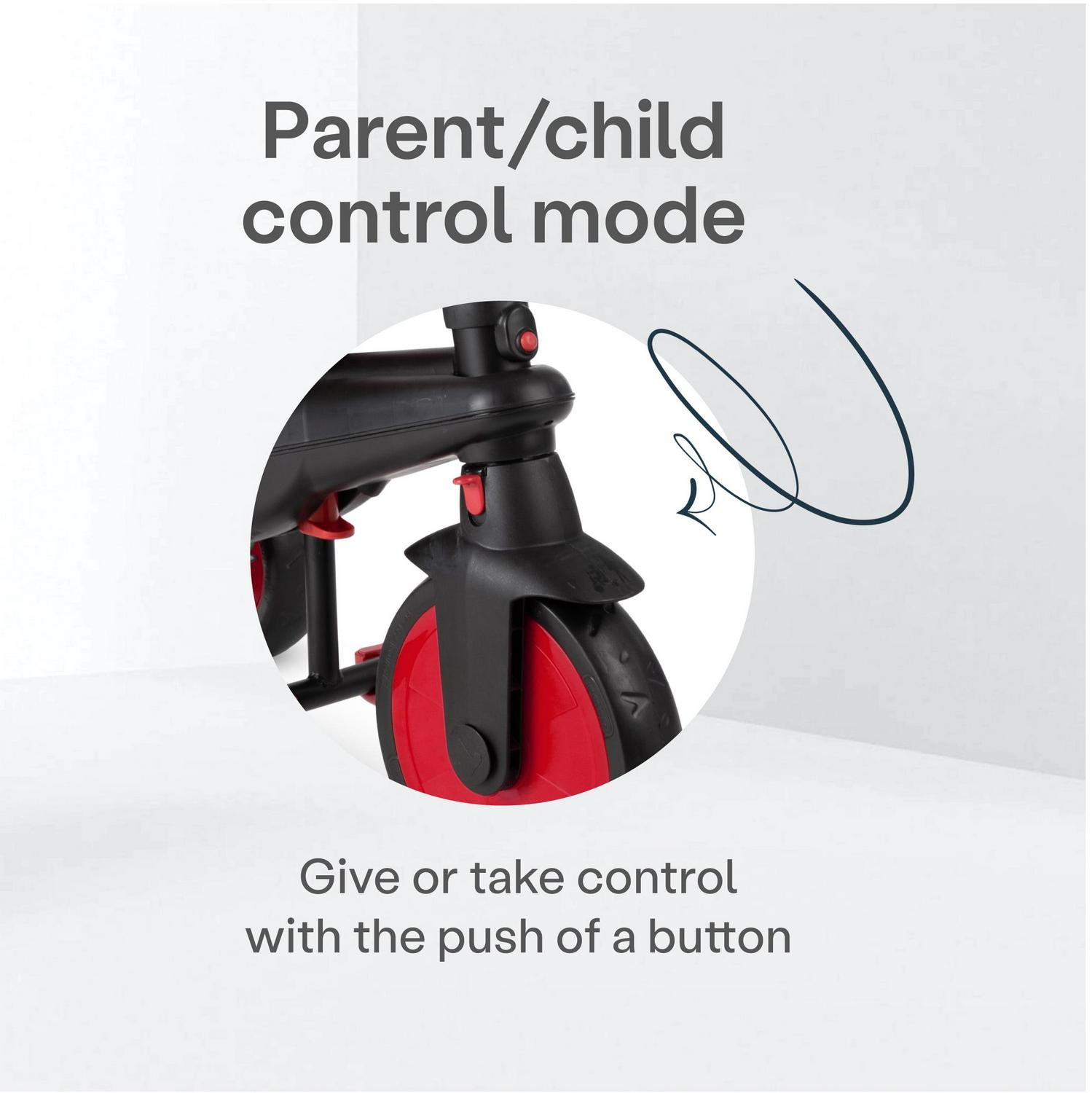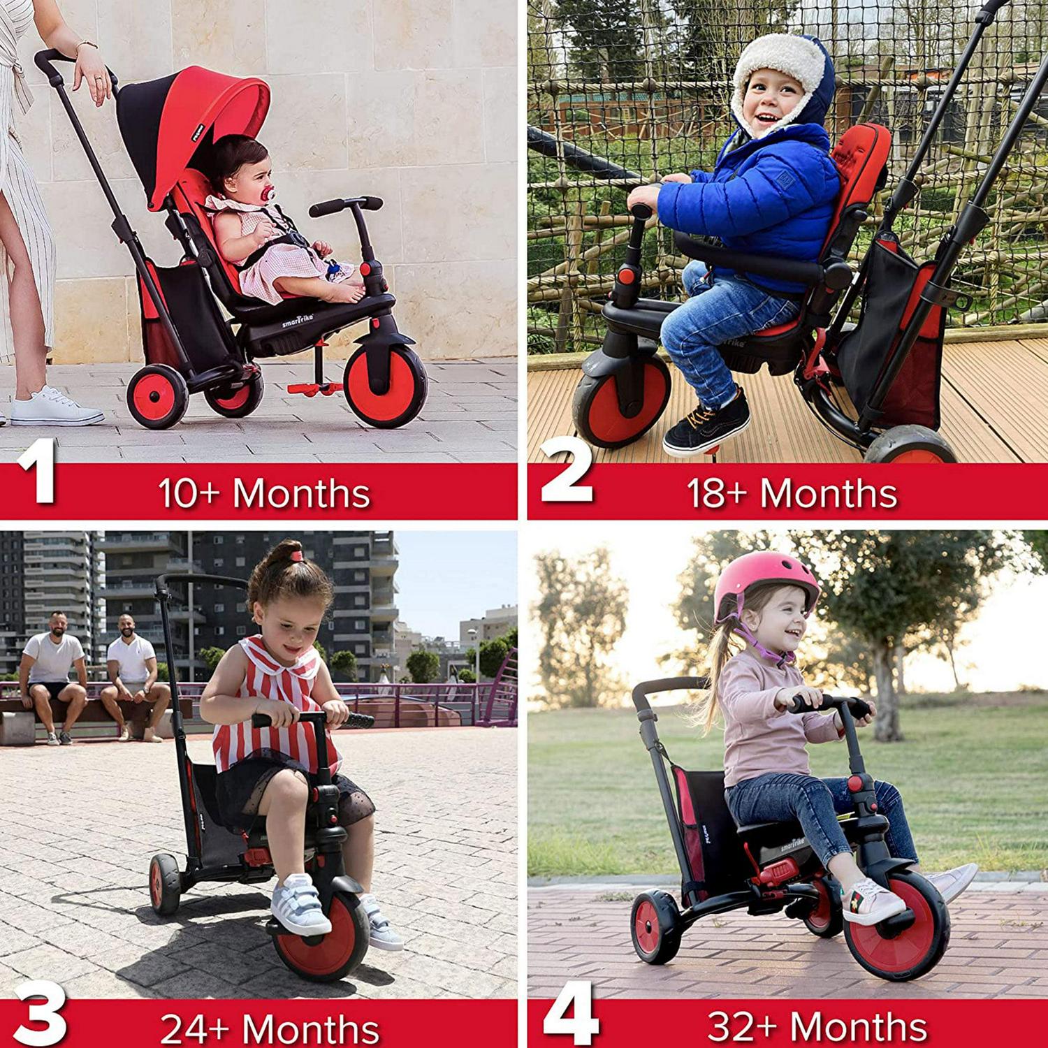 Watch your children learn. gain confidence. and set their own course with the smarTrike 5 in 1 Modular Toddler Stroller Tricycle with 1-Handed Steering. This innovative modular toddler transportation system starts out as a stroller designed for babies as young as 10 months and grows with your child in 6 stages. finally turning into a fully independent trike. The patented touch steering technology creates a comfortable and smooth steering experience. allowing you to guide your everyday adventure with the slightest touch. Providing the smoothest ride your kid can get. the unique shock-absorbing mechanism provides a safe. smooth. and seamless riding experience across rough terrains. With every modern safety feature that makes you and your little one feel safe and confident. including a 5-point harness. safety bar. and rear-wheel locking system. you can let your stress melt away and focus on building your child’s confidence. motor skills. and sense of adventure. Take your stroller trike along wherever the journey leads by easily folding it down into a compact bundle in seconds. Set out on the open road of growth. learning. exploration. and fun with your toddler using the 5 in 1 Modular Toddler Stroller Tricycle with 1-Handed Steering.