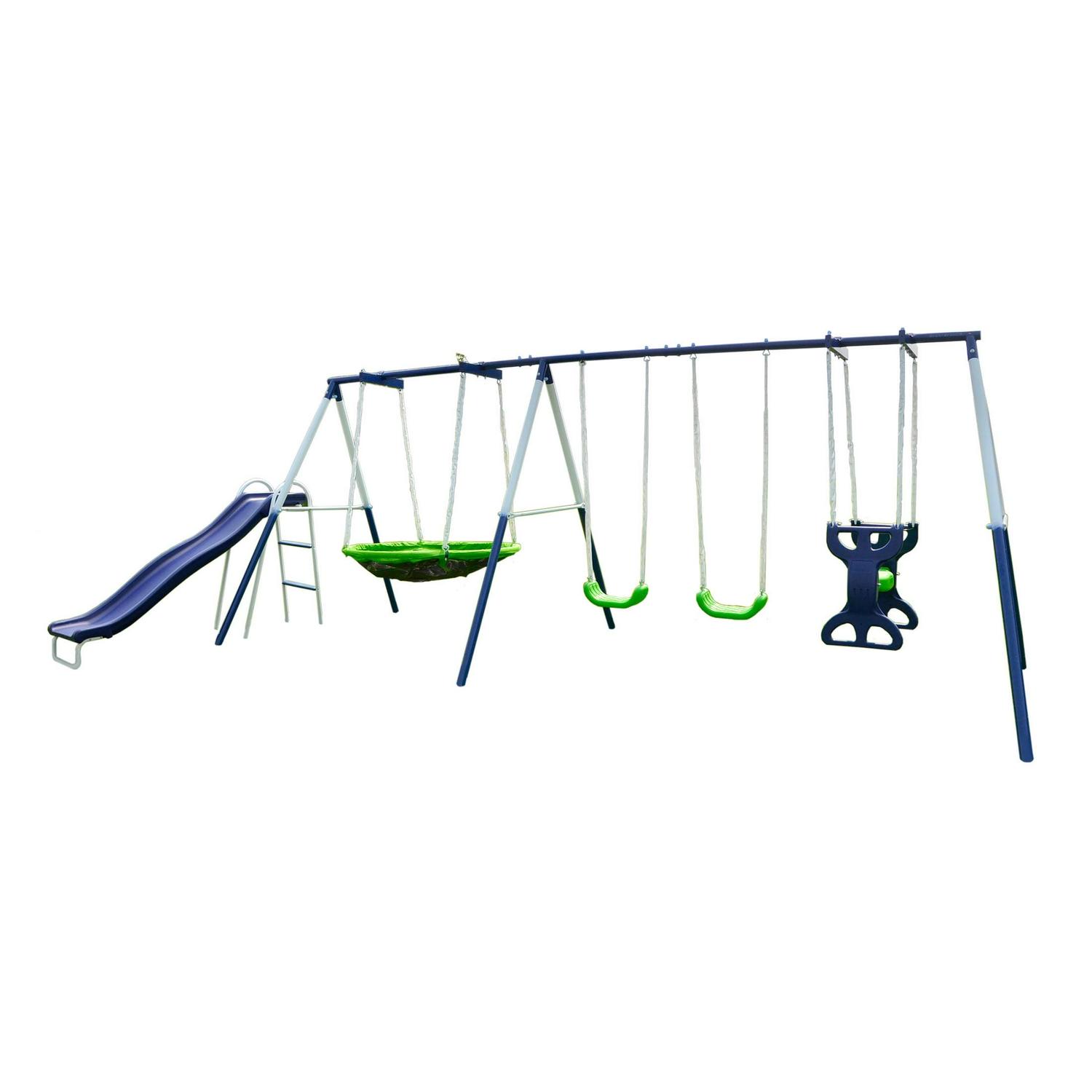 Fun times are had by all when you have the Sportspower Outdoor Rosemead Metal Swing and Slide Set in your backyard. Crafted with heavy-duty. powder-coated steel tubes for more durability. this swing set features two swings with safe vinyl covers to protect hands. The patented flying saucer swing with reinforced webbing holds up to two kids and keeps them safely inside the saucer. The saucer and glider use a four-point chain hanger design for better stability compared to common two-point chain systems. This swing set meets or exceeds all ASTM safety standards. Make great memories with family and friends when you have the Sportspower Outdoor Rosemead Metal Swing and Slide Set.