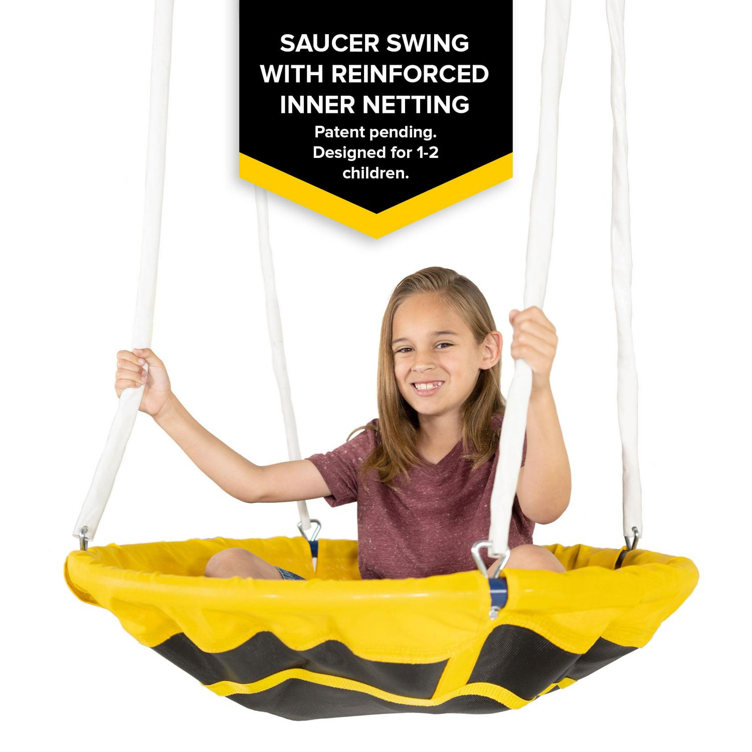 wooden construction is crafted with Northern Europe Scandinavian fir that is denser and safer than competitor swing sets made from China Cedar. With two sling swings and a patented 29-inch diameter flying saucer swing. kids can start swinging into action right away. The Grand Mesa also features metal monkey bars that kids can hang from or swing across for access to the wooden fort! From the fort. they can take a ride on the 8-foot blow-molded slide then climb back up to the fort with the rock climbing wall. The fun continues even below the fort! Kids can play on the picnic bench or in the sandbox (sand not included) for even more possibilities of fun! Unleash the thrill of playing outdoors with the Grand Mesa Wooden Swing Set!