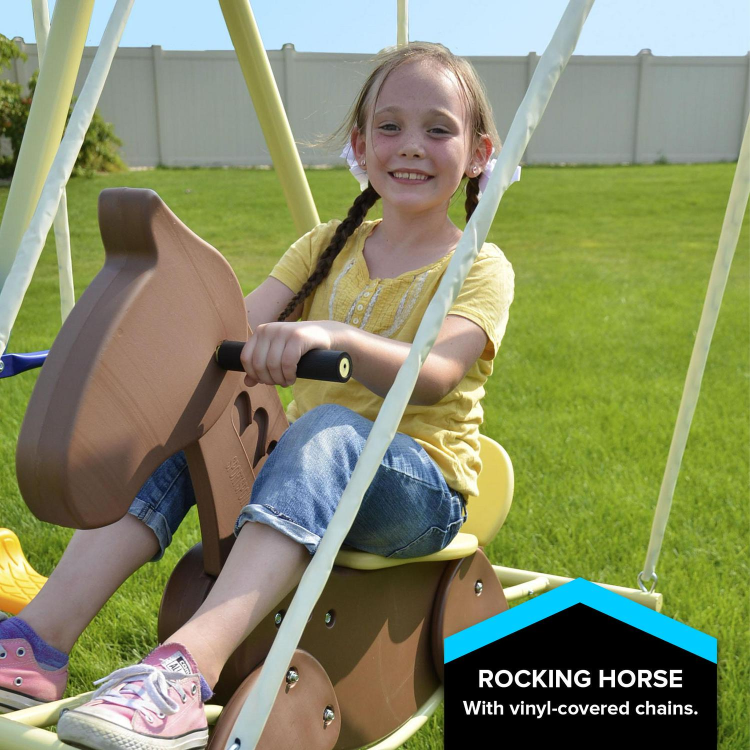 • Sportspower Super 8 Metal Swing Set. Rocking Horse. Saucer Swing. Glide Ride. Two Swings and Slide