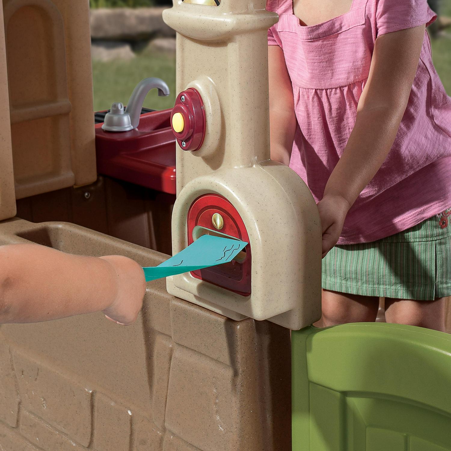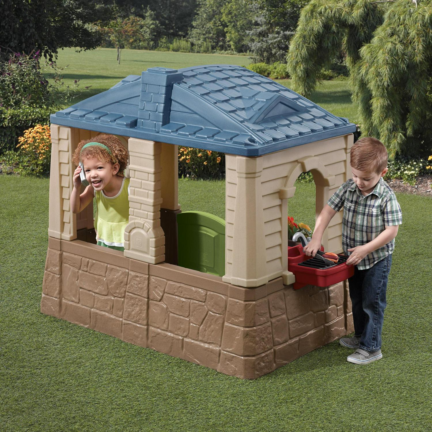 The Happy Home Cottage & Grill is a kids playhouse featuring a neutral color palette. perfect for a seamless addition to your child s outdoor play space. Little ones can take care of their own home just like their adult role models do! They can answer the phone when friends call. cook meals for visitors. and even check the mail. The open design of this outdoor playhouse for toddlers allows interactions at every turn through the windows and Dutch-style doorway. with space for multiple kids to play together. Ready to host a cookout Invite friends and family over to enjoy the pretend grill space as your toddler cooks up some delicious meals. From the working shutters and front planter box to electronic doorbell and pass-through mailbox. this playhouse has so many realistic features to enhance pretend play!
