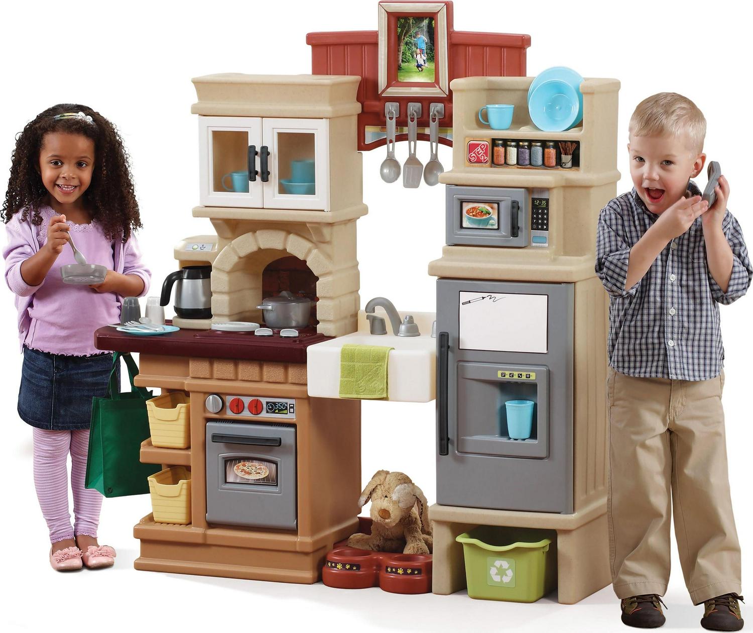 Let kid’s imaginations run wild with the Step 2 Heart of the Home Kitchen. This lifelike playset is designed to look just like a new modern kitchen. It has translucent cupboard doors and an imaginary full-size refrigerator. oven and stove made to look just like stainless steel. The deep farmhouse sink looks like the real thing. while the reusable grocery bag is just like the one at home. The Heart of the Home kitchen play set comes with a 41-piece accessory set. so children can pretend to make full meals. There’s even a pet nurturing center. The stovetop makes bubbling noises for a realistic feel as kids cook. There is also a frame where the kids can put their own family photos. Lastly. this kids kitchen comes with a limited 2-year warranty.